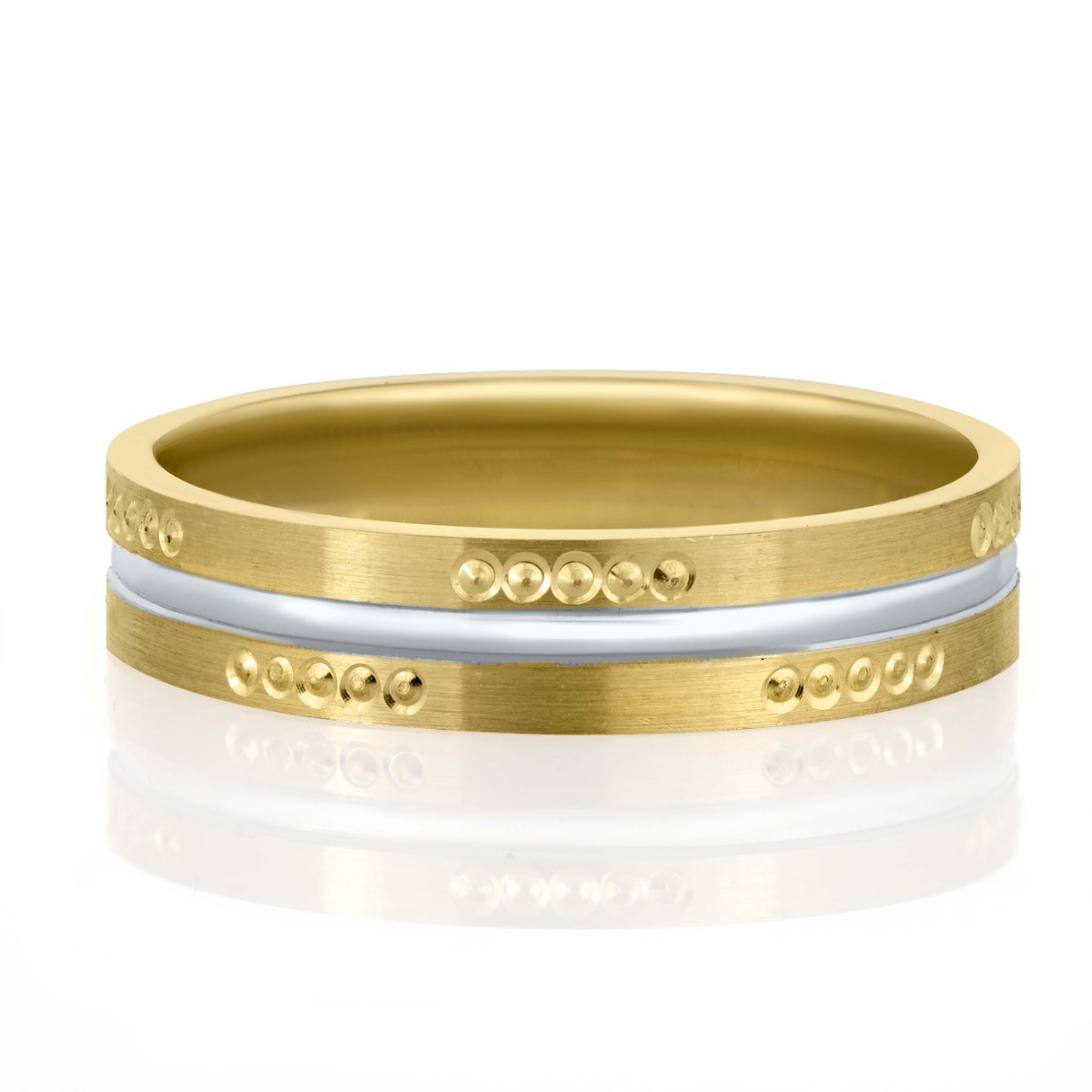 Елегантна брачна халка от двуцветно злато, съчетаваща топлия блясък на жълтото злато с изискан акцент от бяло злато. Фината матирана повърхност и деликатните декоративни елементи придават модерен и стилен характер. Прецизната изработка осигурява комфорт при носене и дълготрайна красота. Идеален избор за символ на любов, вярност и споделено бъдеще.