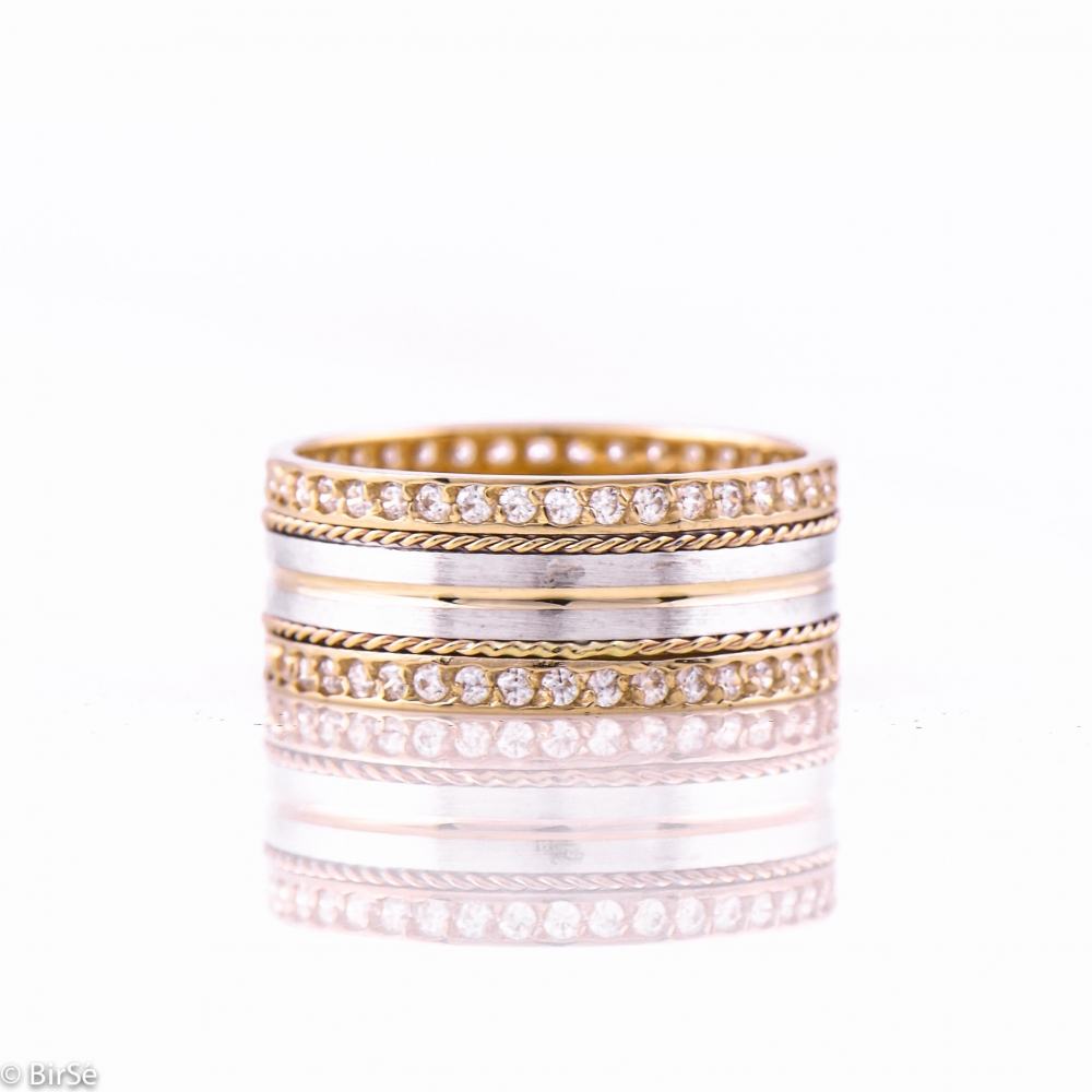 Художествено изработена дамска брачна халка с царствени елементи и нежно преливане на стил и класа. Изключително ефектна изработка от фино съчетание на бяло и класическо жълто злато, подсилени от блясъка на искрящи камъни циркони.