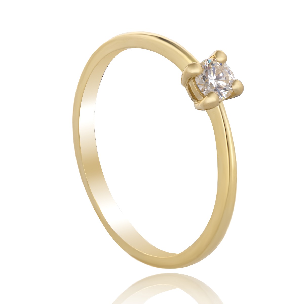 Омаен дамски пръстен с изящна класическа форма и изработка изцяло от жълто злато. Каса с четири зъбчета е обгърнала в нежна прегръдка бляскав диамант 0,19 ct. Елегантно бижу, с което да очаровате дамата на сърцето си.