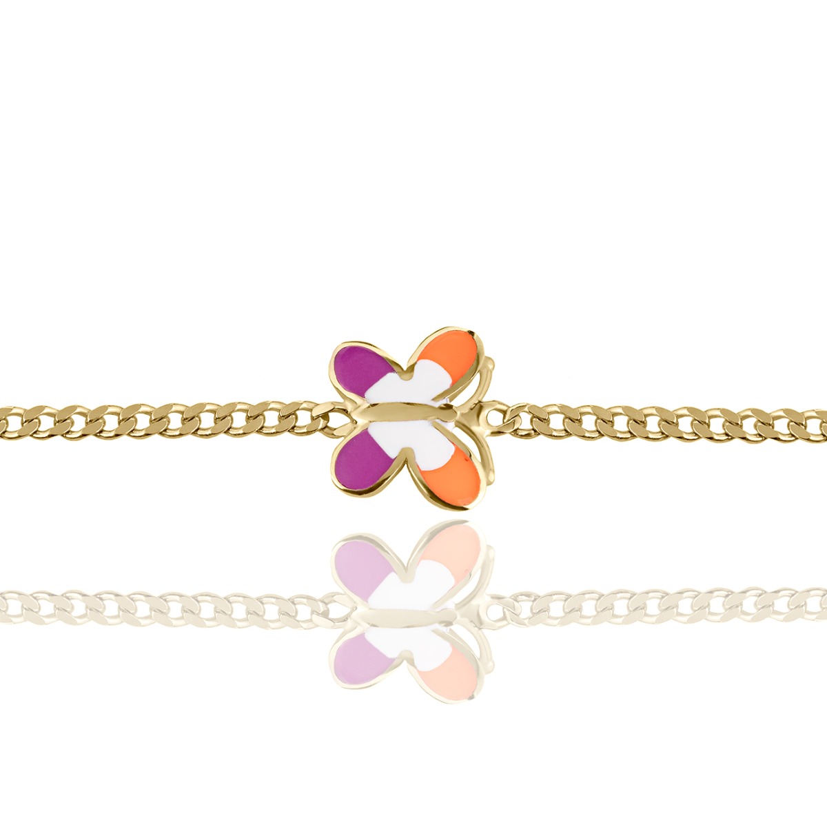 Очарователна детска гривна, изработена от 14-каратово жълто злато, която съчетава елегантност и игриво излъчване. Акцентът е цветна пеперудка с емайл покритие в пъстри тонове, която внася свежест и радост във визията. Леката и удобна гривна е специално създадена за детска ръчичка и е чудесен избор за подарък за рожден ден, кръщене или друг специален повод.