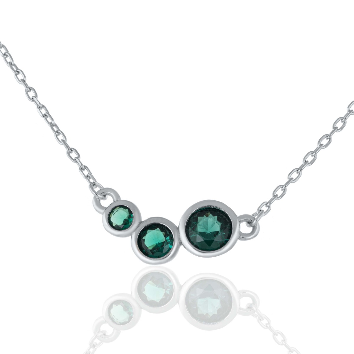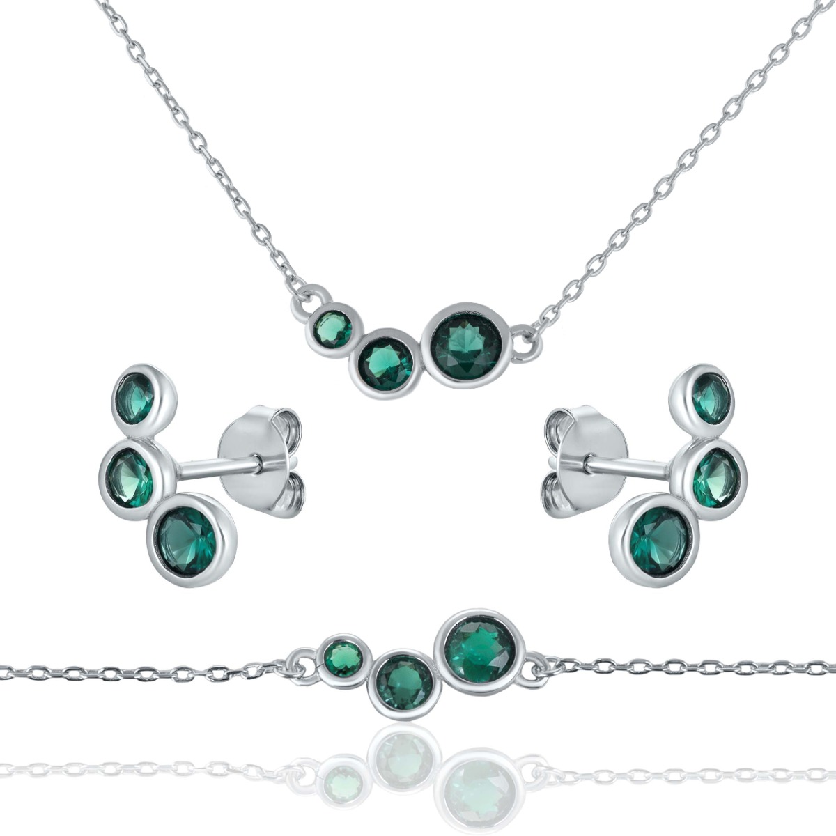 Елегантен сребърен комплект със стилни зелени циркони, които придават свежест и изтънчен блясък. Камъните са подредени в деликатна линия с различни размери, създавайки модерен и хармоничен дизайн. Комплектът включва колие, обеци и фина гривна, които се съчетават перфектно и подчертават женствеността. Подходящ избор както за ежедневна елегантност, така и за специални поводи.