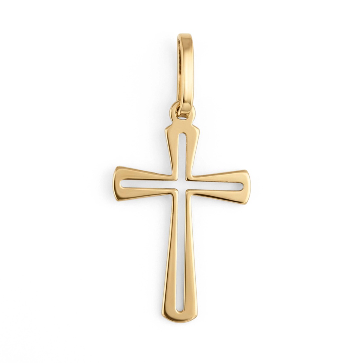 Изработен от жълто злато с гладко полирано покритие, кръстът се комбинира лесно с различни видове синджири и стилове, превръщайки се в универсално и смислено бижу.