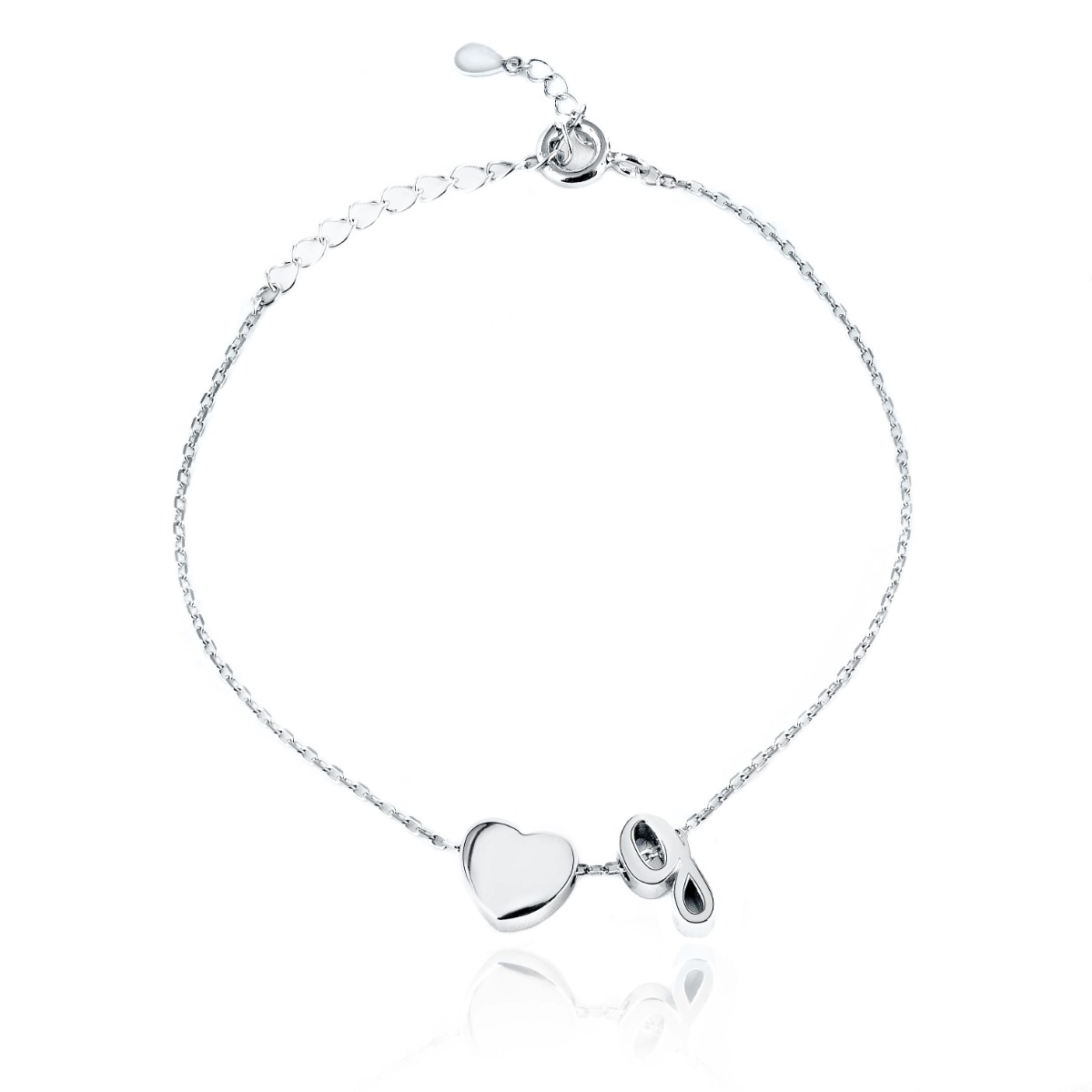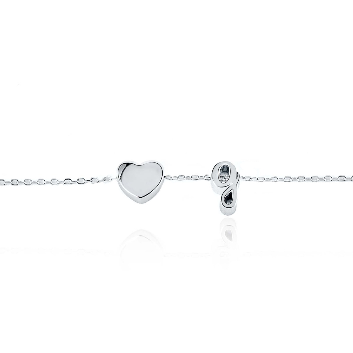 Очарователна мека гривна с изящна изработка от нежно родирано сребро, съчетано с елементи на красиво 3D сърчице, латинска буква ,,g" и предпочитания от всички регулируем размер.