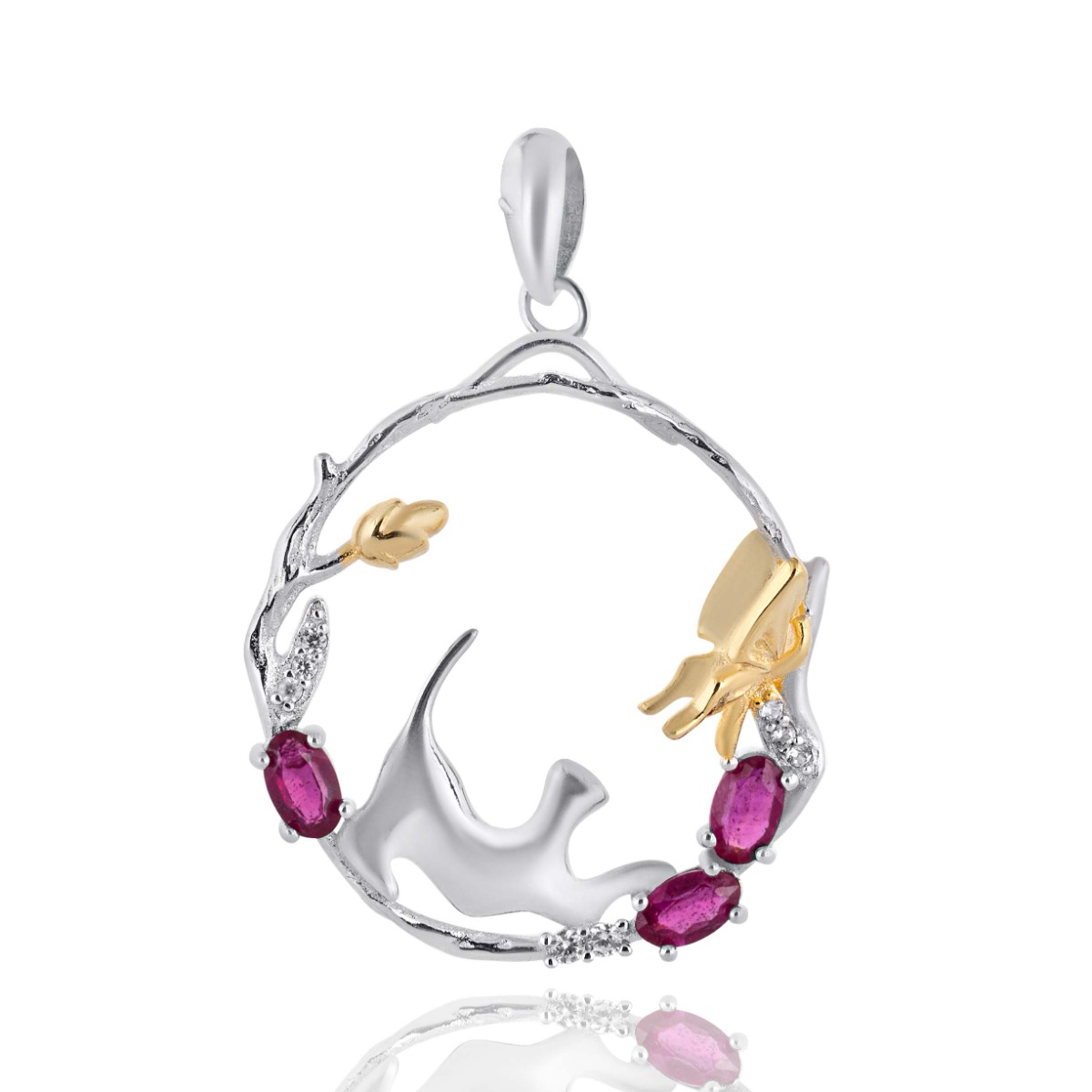 Очарователна сребърна висулка с елегантен природен мотив, акцентирана с полет на пеперуда над грациозна котка и нежни камъни естествен рубин. Дизайнът символизира красотата на природата и лекотата на пеперудите, излъчвайки изтънченост и женственост. Тази висулка е идеалното бижу за всеки повод, добавяйки нотка на грация и блясък към вашия стил.