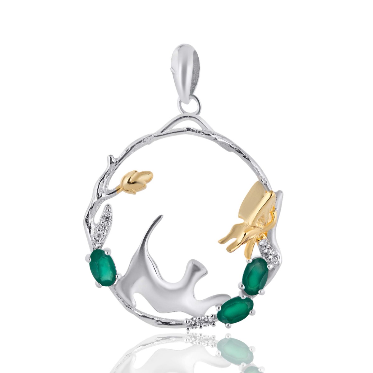 Очарователна сребърна висулка с елегантен природен мотив, акцентирана с полет на пеперуда над грациозна котка и нежни камъни естествен зелен агат. Дизайнът символизира красотата на природата и лекотата на пеперудите, излъчвайки изтънченост и женственост. Тази висулка е идеалното бижу за всеки повод, добавяйки нотка на грация и блясък към вашия стил.