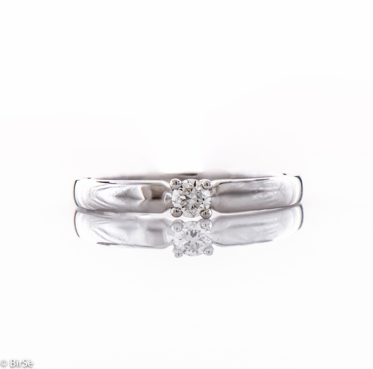 Прелестен годежен пръстен, изработен от бяло злато. Бижуто е в съчетание със сияен кръгъл диамант – брилянт и е подходящ избор за дамите, чиято елегантност е тяхна силна страна.