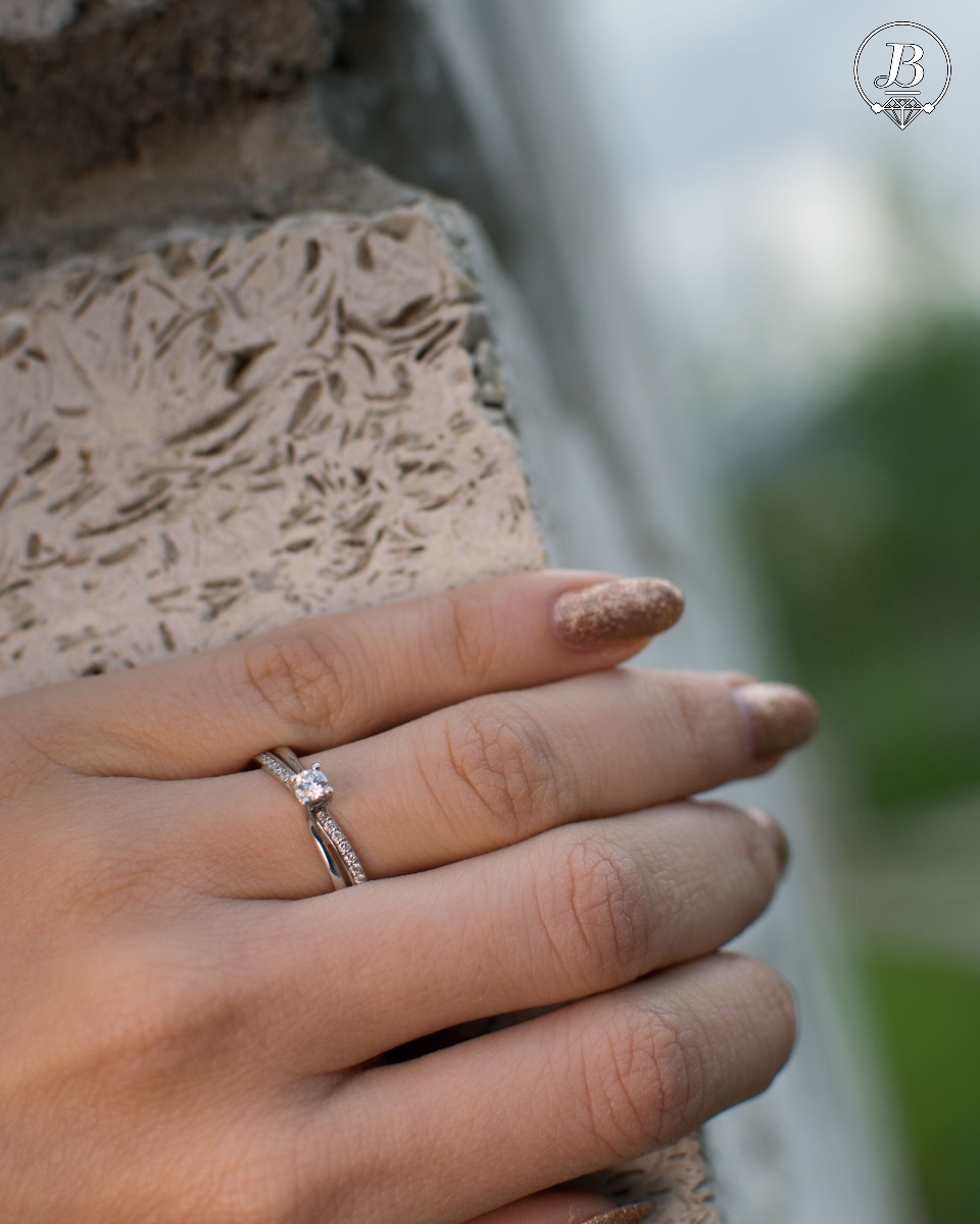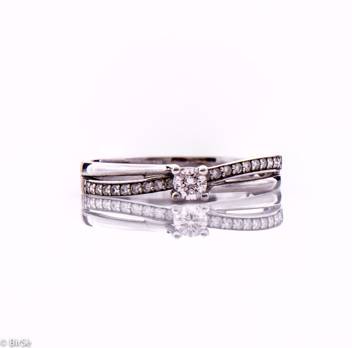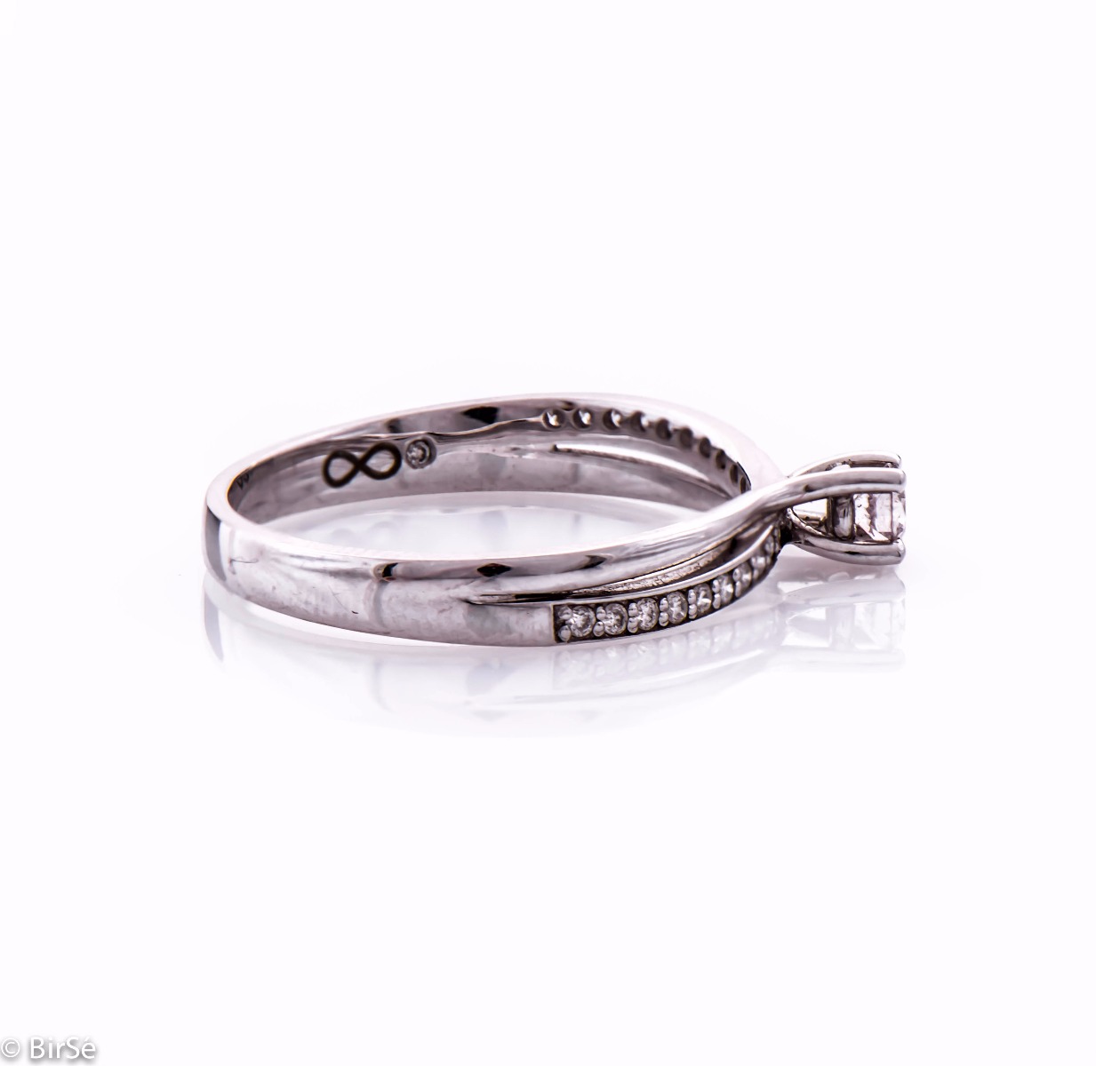 Вплетена красота от преливащ блясък на ринг от бяло злато и ринг с инкрустирани циркони. Център на бижуто е невероятен брилянт, а от вътрешната си страна пръстенът е с гравиран символ на безкрайност, както и малък инкрустиран диамант.