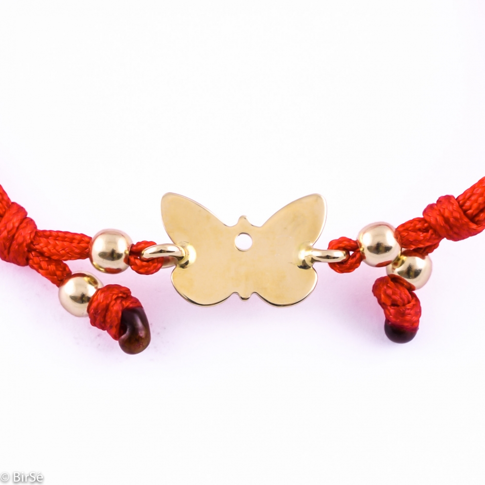 Нежна гривна с червен конец, предложение към дамите. Стилна изработка на изчистена пеперудка, изцяло от жълто злато. Подходяща е за всяка дама, благодарение на регулируемия си размер.