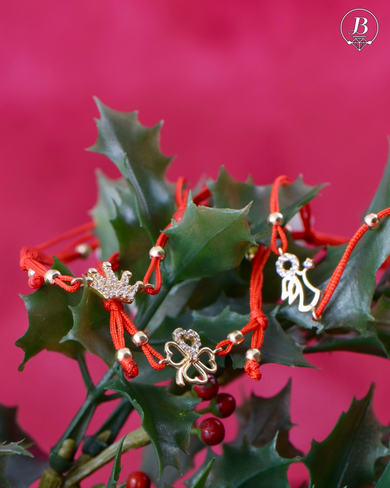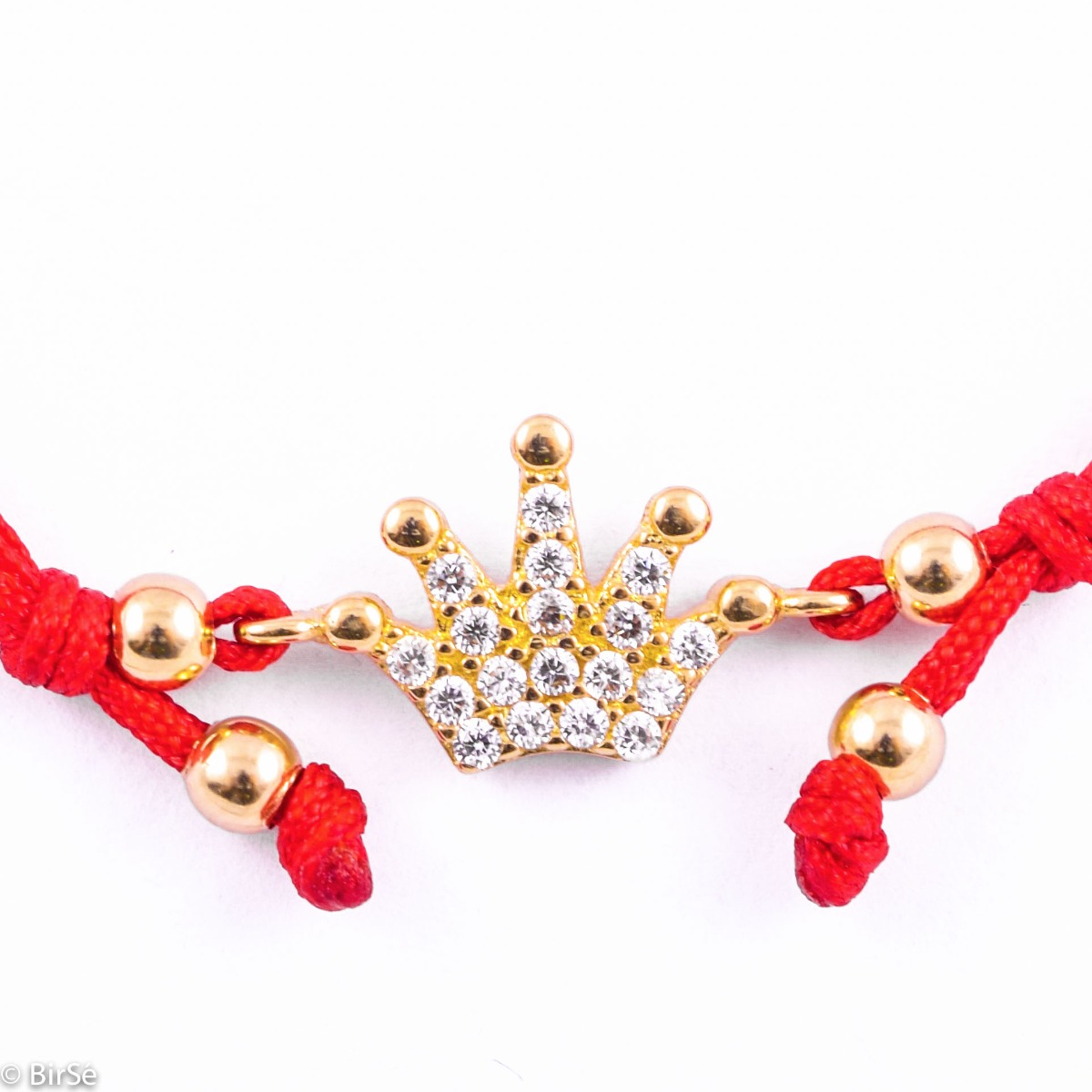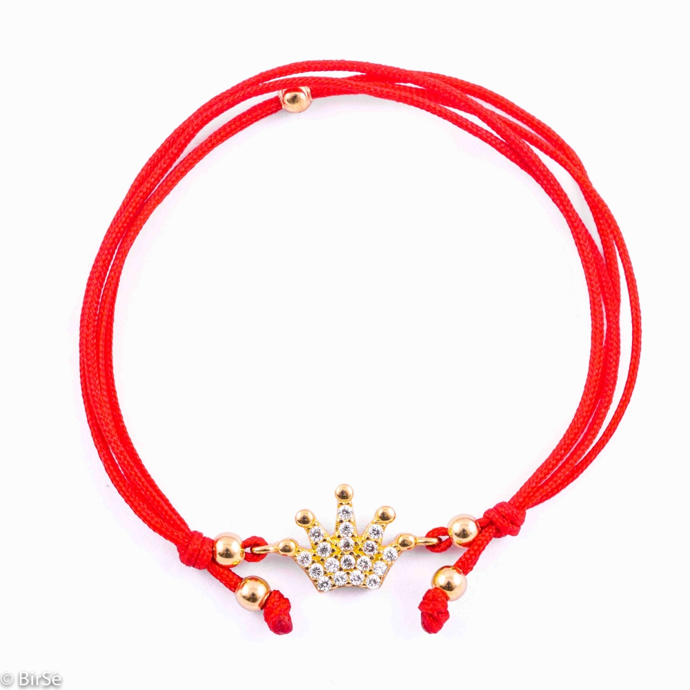 Кралската корона – изключително стилна дамска гривна с червен конец и кралска корона, изработена изящно изцяло от класическо жълто злато в съчетание с нежни циркони.