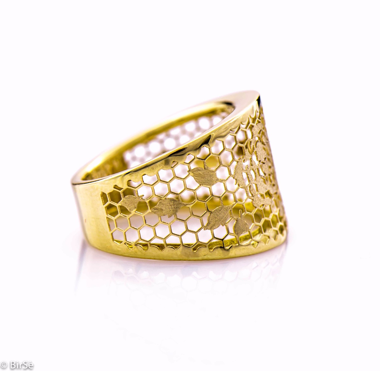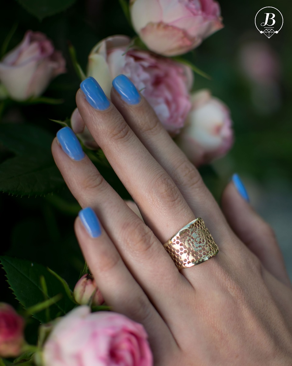 Възхитителен италиански стил – пръстен със ситни дантелени мотиви от жълто злато. Изтънчен избор, подходящ за любителите на класическата красота.