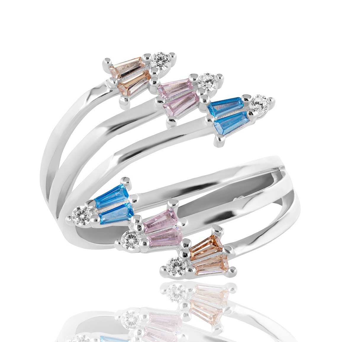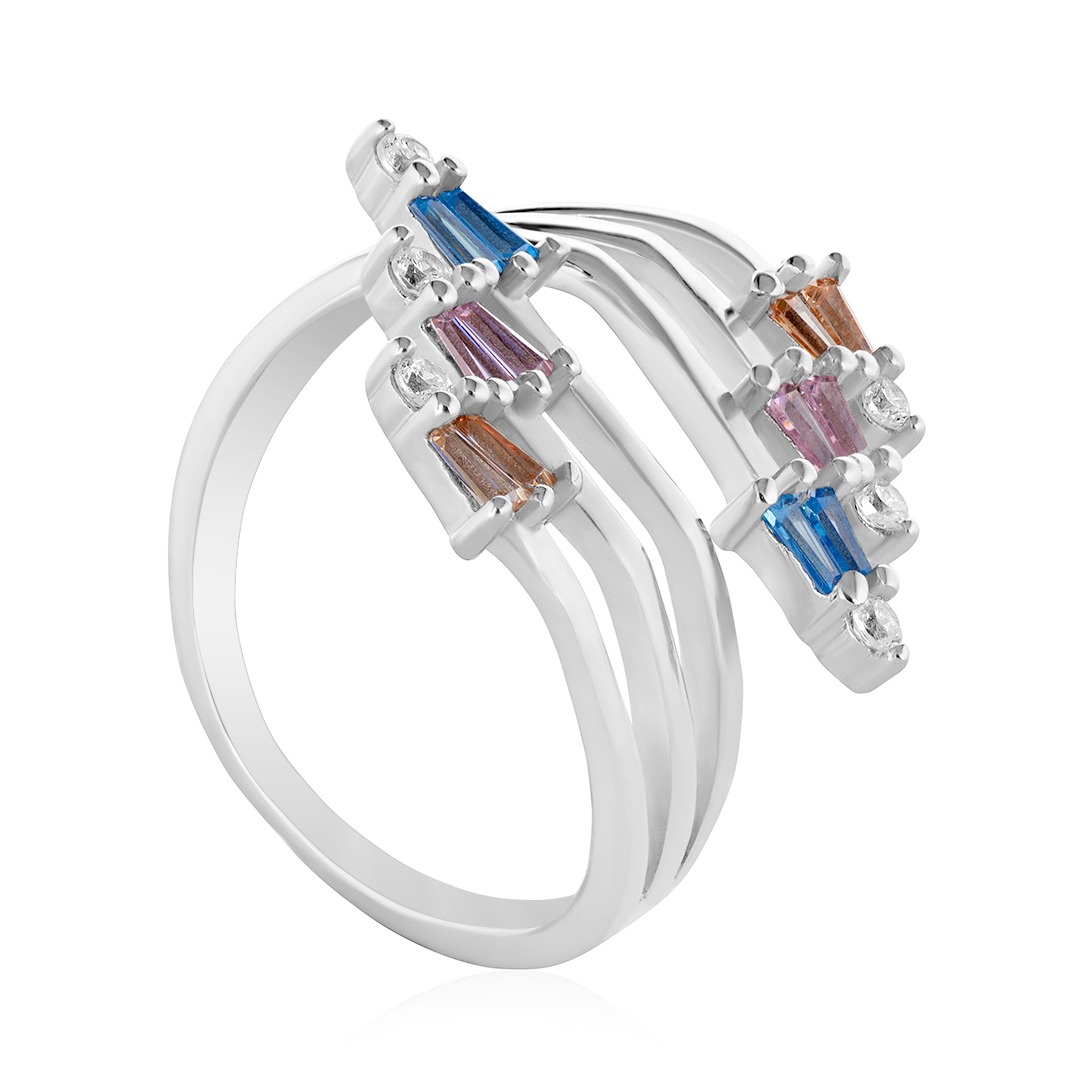 Този модерен и елегантен сребърен пръстен впечатлява с уникален дизайн и изтънчена изработка. Неговата структура е оформена от няколко деликатни, извити сребърни линии, които създават усещане за динамика и лекота. Върховете на всяка от тези линии са украсени с блестящи цирконии в различни цветове – небесносиньо, нежно розово и топъл кехлибарен нюанс. Всяка цветна комбинация е завършена с малък, безцветен цирконий, който придава допълнителен блясък и изящество.