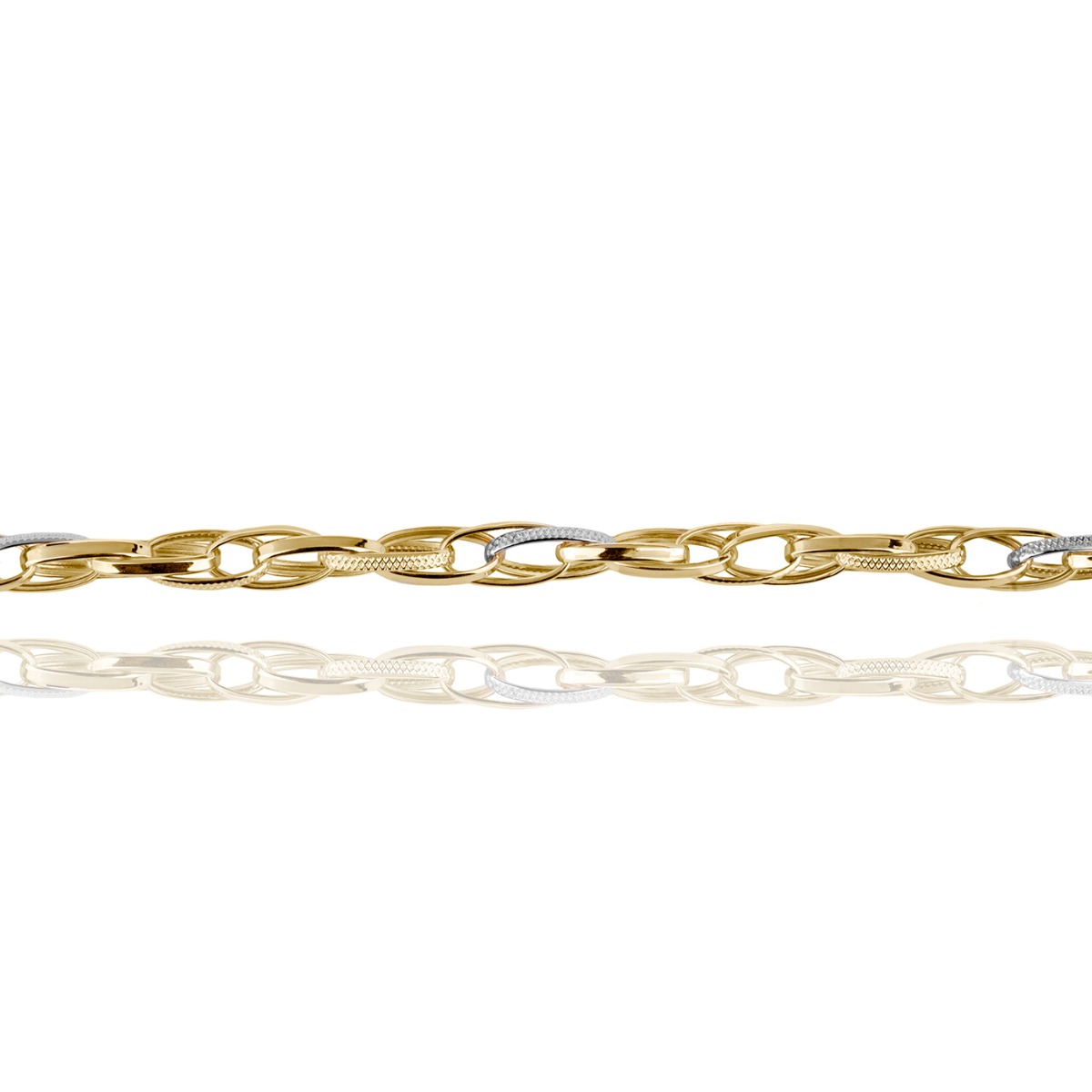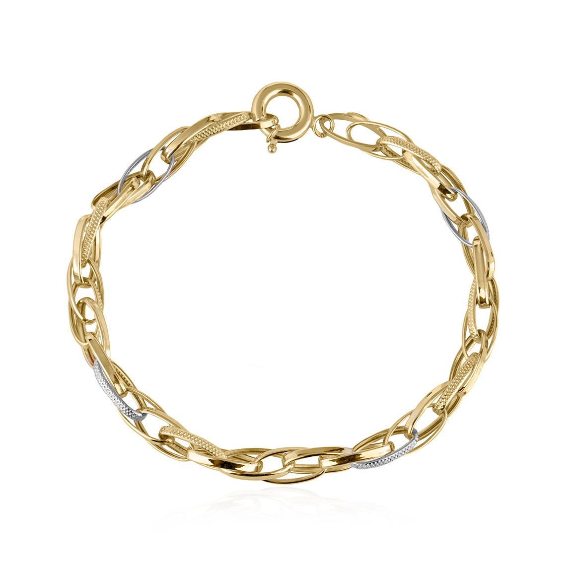 Изискана и женствена, тази гривна е изработена от 14-каратово злато (585 проба) и впечатлява с нестандартна и красива плетка. В дизайна се преплитат жълто и бяло злато, което добавя блясък и създава усещане за динамика и стил. Гривната е лека, удобна и изключително подходяща както за ежедневието, така и за специални поводи.