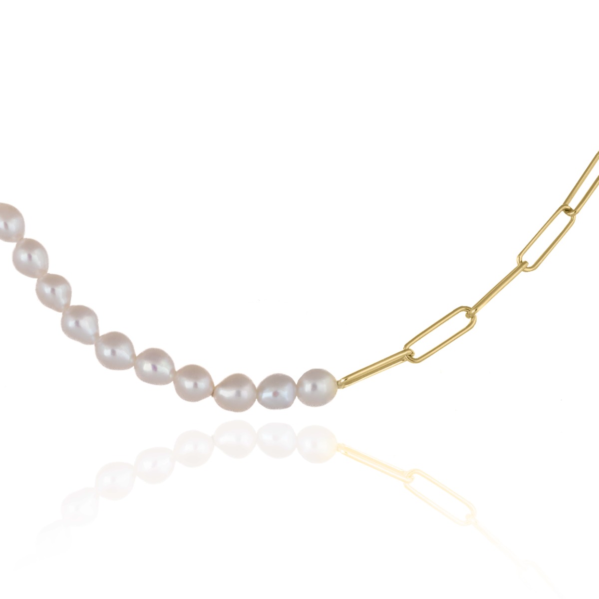 Модерно и изискано колие, което комбинира елегантността на естествени бели перли (5 мм) с актуална верижка от жълто сребро. Дизайнът съчетава класика и съвременен стил, създавайки нежно, но запомнящо се бижу.