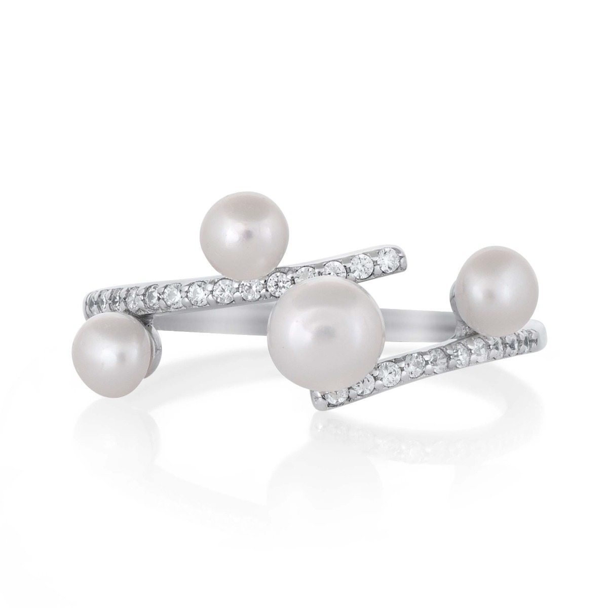 Подчертайте фината страна на своя стил с този изящен сребърен пръстен, декориран с четири перфектно подбрани бели перли и блестящи циркони. Дизайнът е модерен, обемен и едновременно изключително женствен, което го превръща в прекрасно бижу за всякакви поводи.