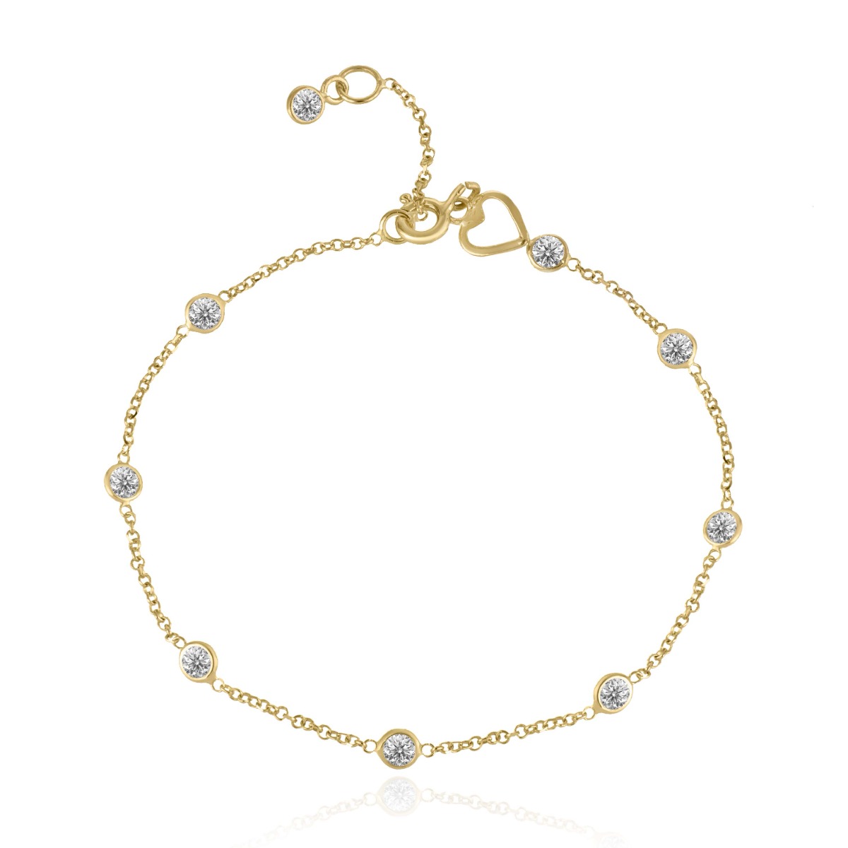 Нежна златна гривна, изработена от висококачествено 14K жълто злато, украсена с прецизно фасетирани бляскави циркони, разположени равномерно по цялата дължина. Верижката е фина и елегантна, а малкото златно сърце до закопчалката придава романтичен и завършен акцент. Подходяща за ежедневно носене или като изискан финален щрих към по-елегантна визия. Перфектен избор за подарък – стилен, женствен и блестящ като чувствата, които изразява.