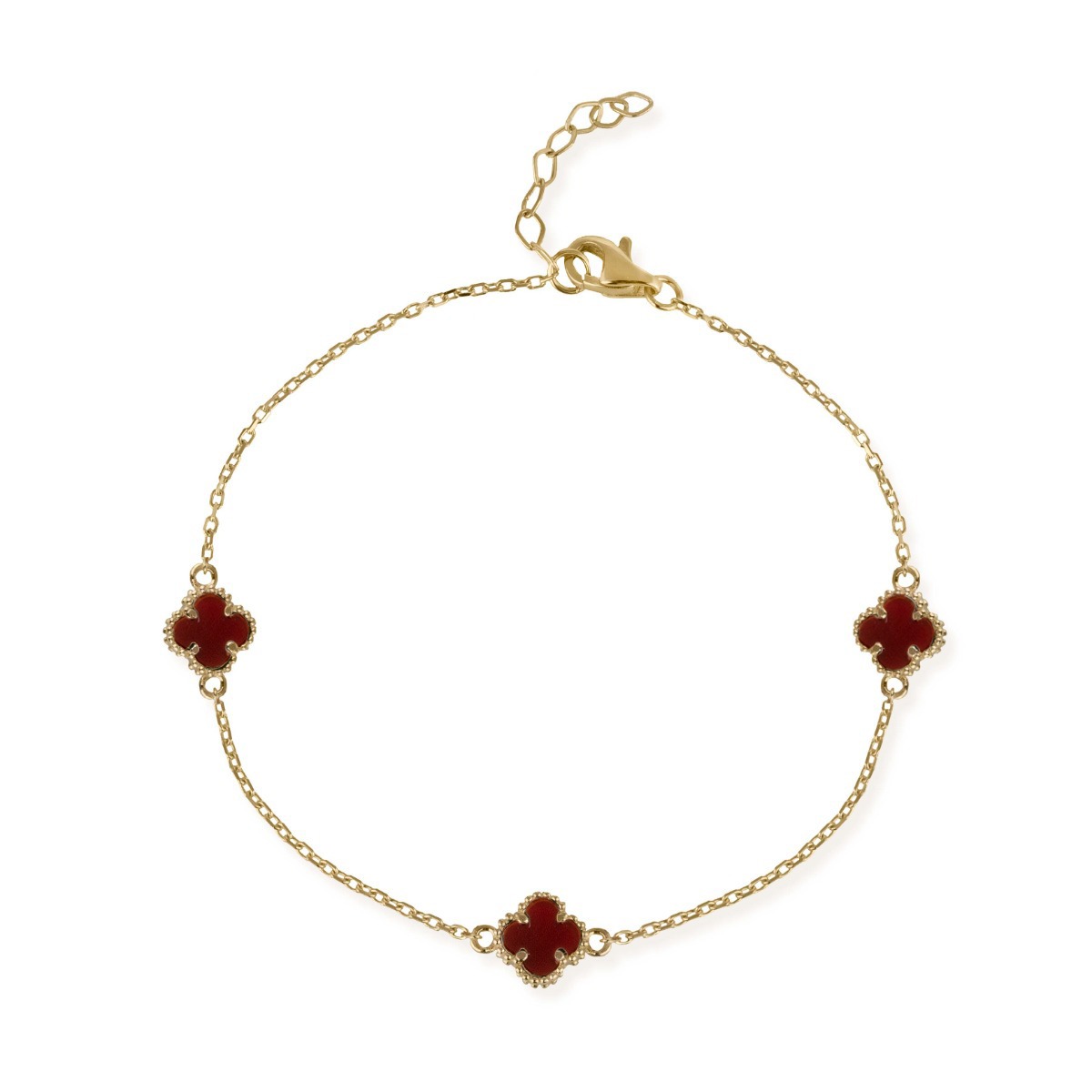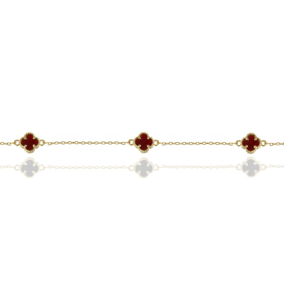 Нежна златна гривна с три декоративни детелини, изработени от красив карнеол. Топлият червен нюанс на камъка създава стилен контраст със златната верижка и придава елегантно излъчване. Фината изработка и изчистеният дизайн я правят подходяща както за ежедневието, така и за специални поводи. Елегантен аксесоар, който добавя цвят и изисканост към всяка визия.