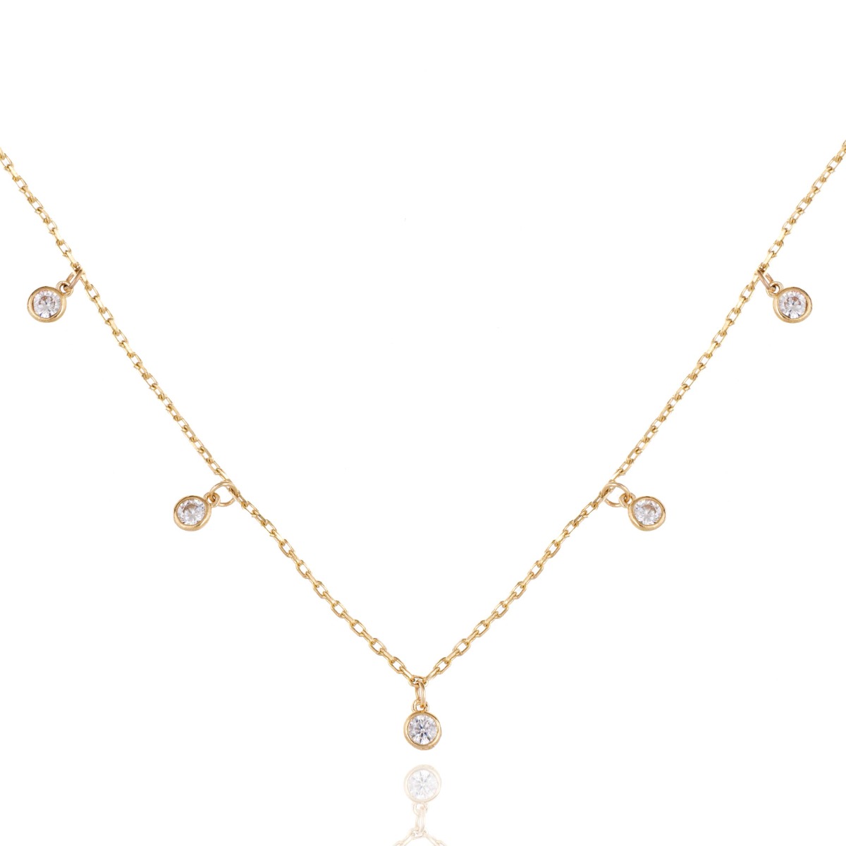 Нежно изкушение за дамите - пленително колие, изработено от фино жълто злато. Върху елегантна верижка, класическа плетка, са прикрепени висулки с инкрустирани бляскави циркони. Колието е красиво предложение за подарък на любимата дама.