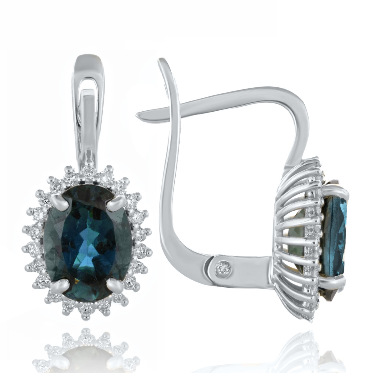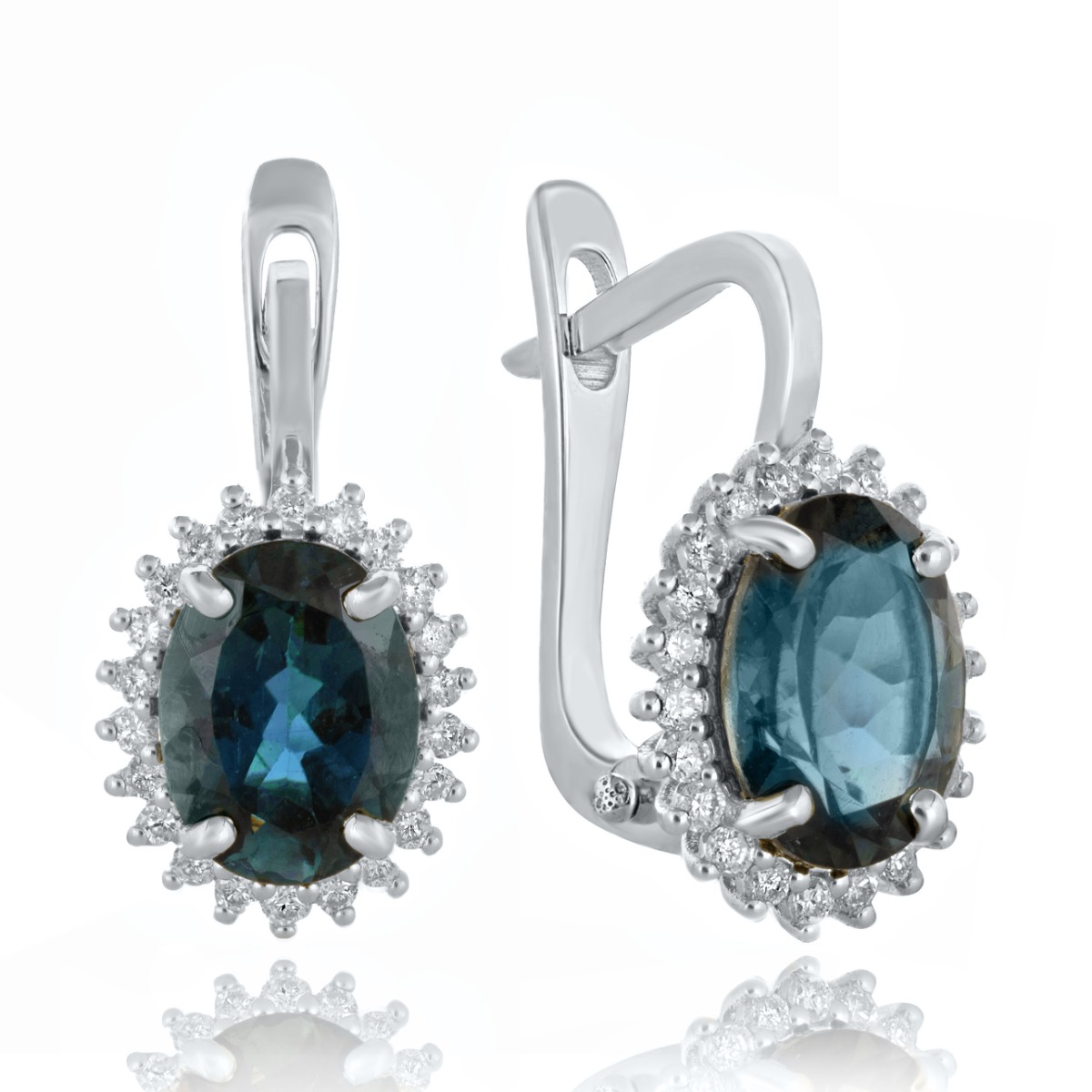 Стилни обеци модел ,,Маркиза" с английско закопчаване. Блестящи диаманти и уникален, магнетичен Лондон топаз оформят пленително бижу. Прелестните диаманти са с честота SI. Обеците са част от комплект с висулка и елегантен пръстен. Всички бижута с естествени камъни са придружени от специален сертификат, удостоверяващ автентичността им. На този сертификат можем да изпишем и лично послание за Вас или за когото е бижуто. Вижте още информация тук.