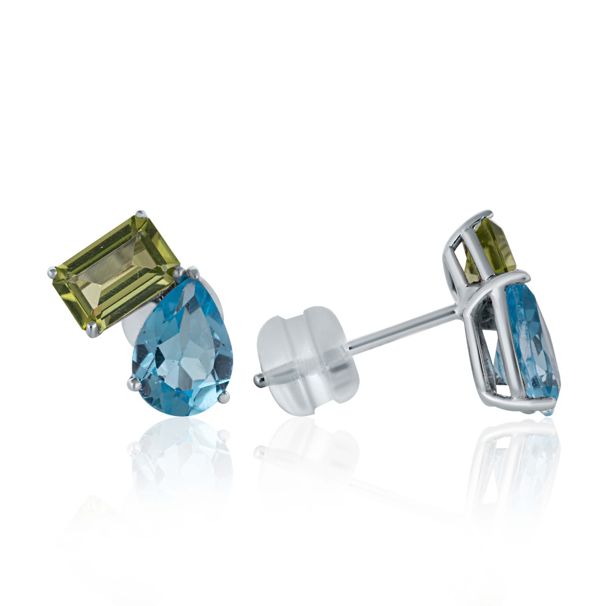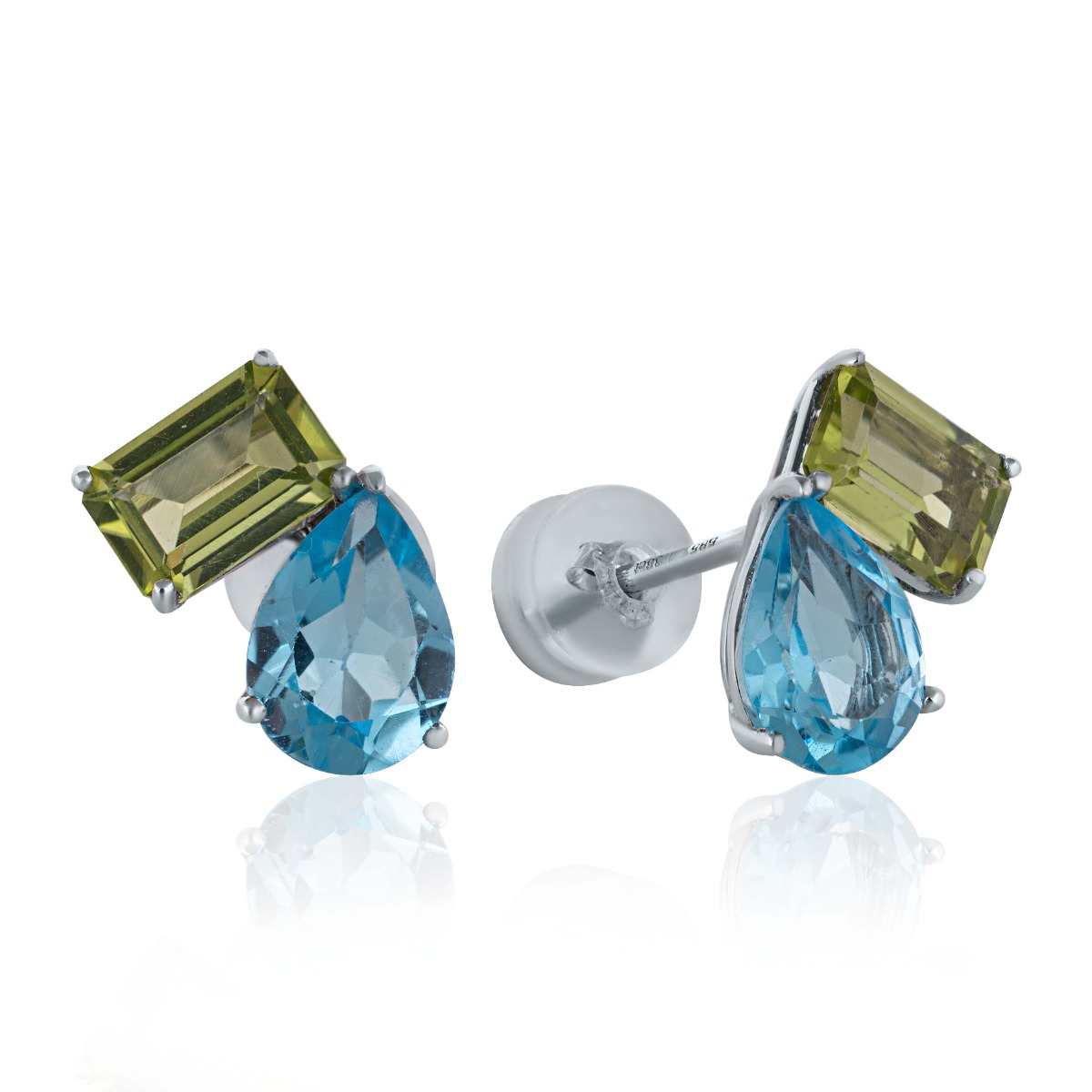 Ефектни обеци от 14 к бяло злато, съчетаващи свежата хармония на естествен син топаз и перидот с общо тегло 2,76 ct. Контрастът между наситеното синьо и зелено придава модерен и отличителен характер. Изчистеният дизайн ги прави подходящи както за ежедневна елегантност, така и за специални поводи. Стилен акцент за любителите на цветните скъпоценни камъни.