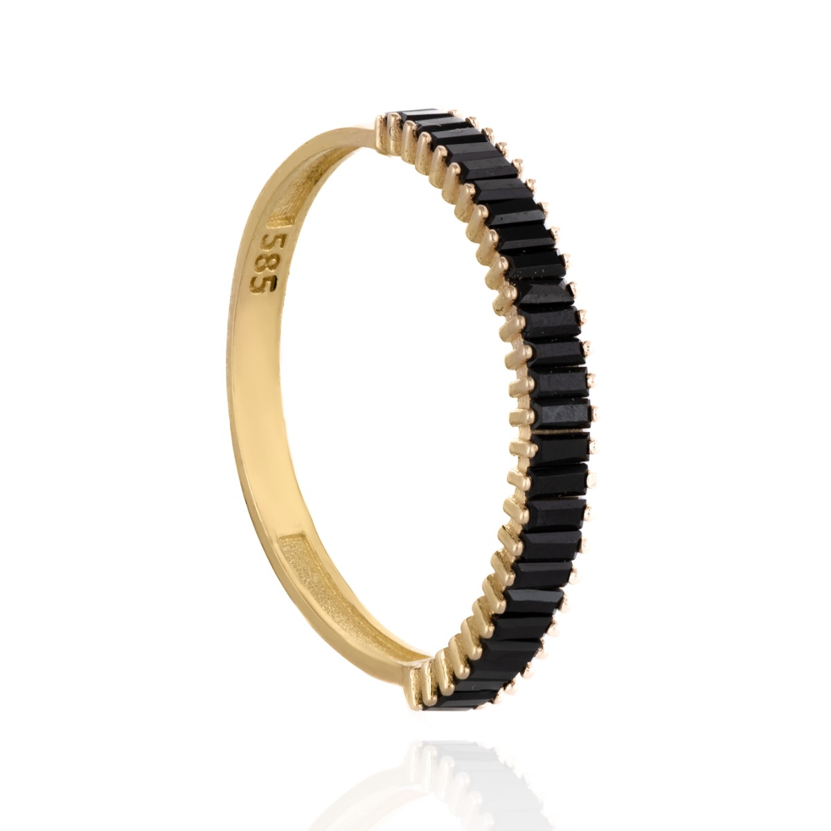 Нежно-елегантен дамски пръстен с прецизна изработка, преплитаща класическо жълто злато с мистиката на черни циркони с форма багет. Стилен дизайн, подходящ за всеки ден.