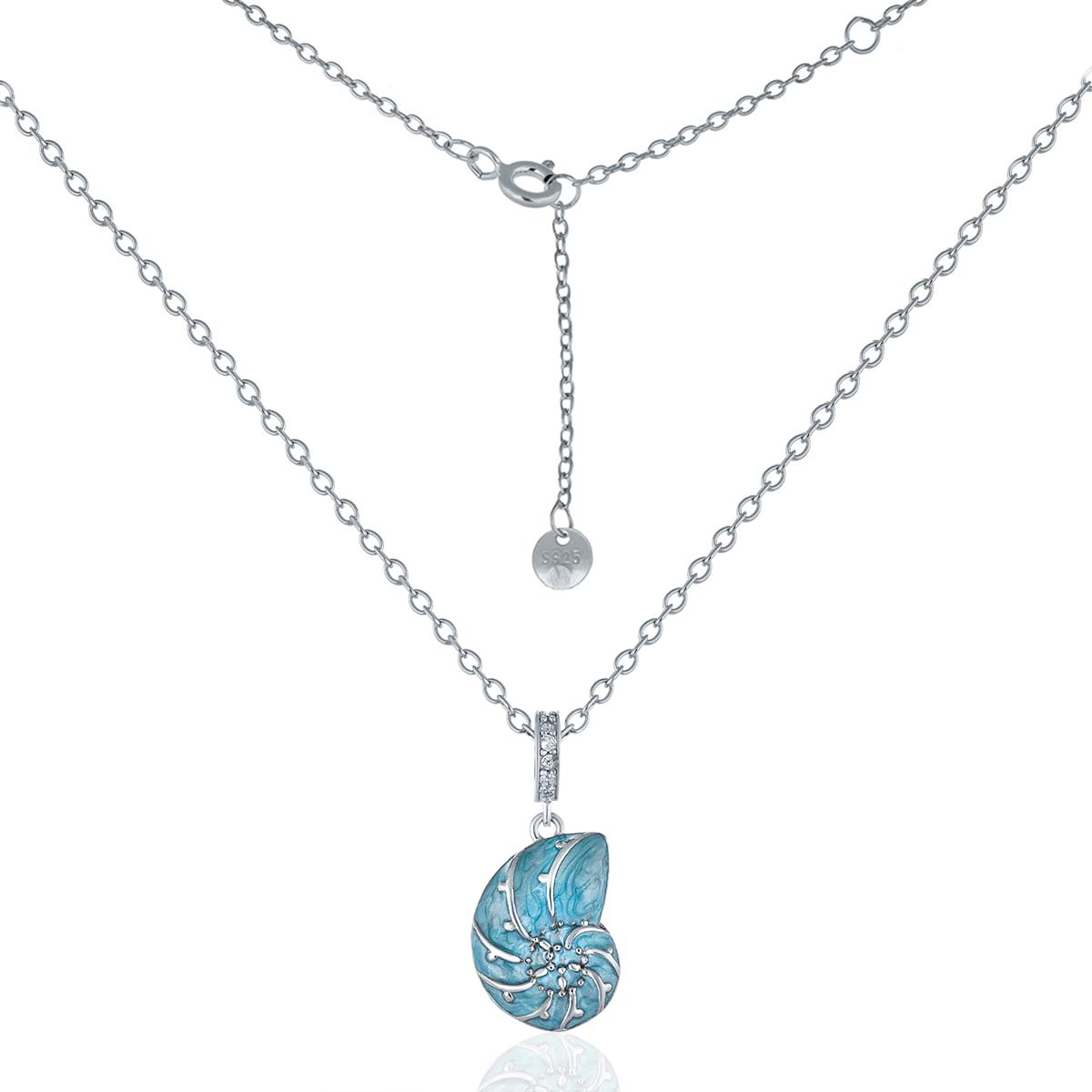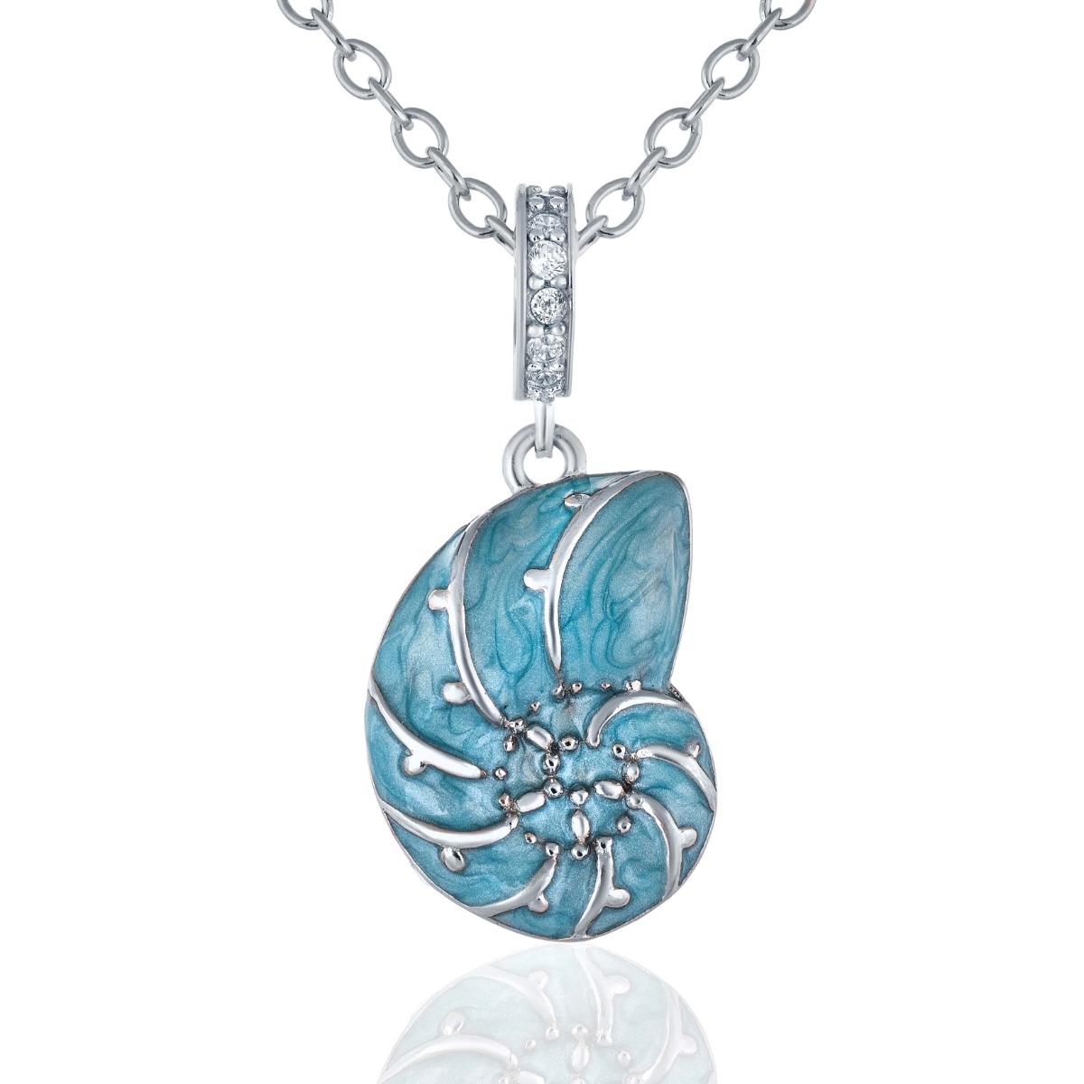 Елегантно сребърно колие с артистична висулка, вдъхновена от красотата и тайнствеността на морето. Дизайнът наподобява морска раковина, украсена с преливащ тюркоазен емайл и фини сребърни орнаменти. Халката е инкрустирана с блестящи циркони за допълнителен блясък и луксозно излъчване.