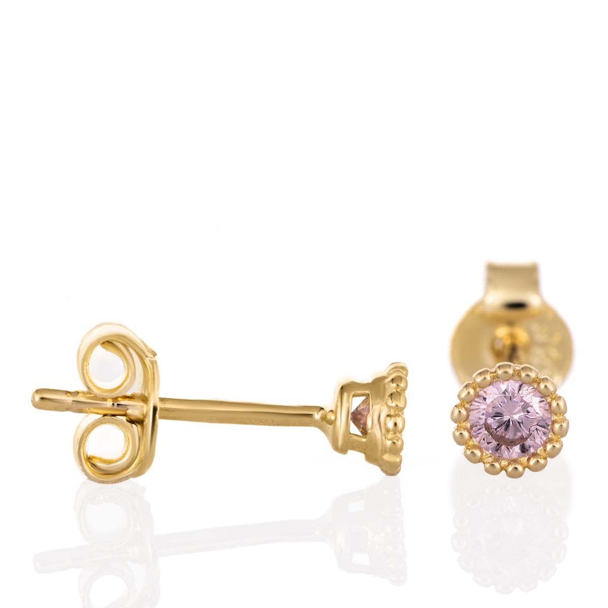 Очарователни нежни обеци от класическо жълто злато, красиво обгърнало бляскав циркон с нежно розов цвят. С удобното си закопчаване с щифт бижуто е подходящо за дами на всякаква възраст и умело може да бъде съчетано с други златни украшения.