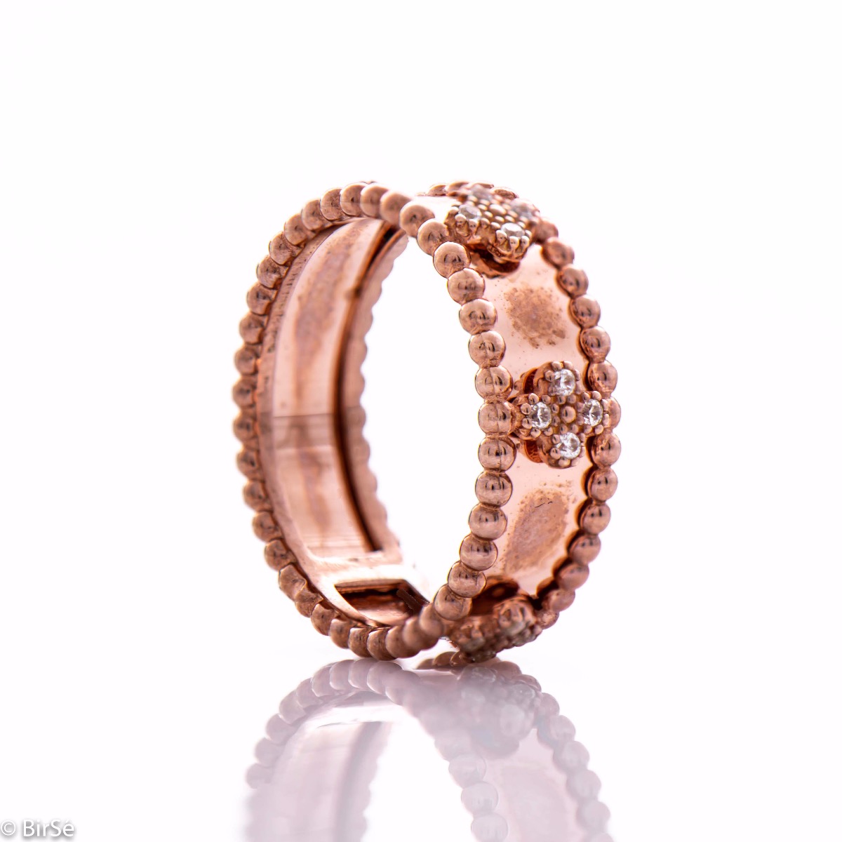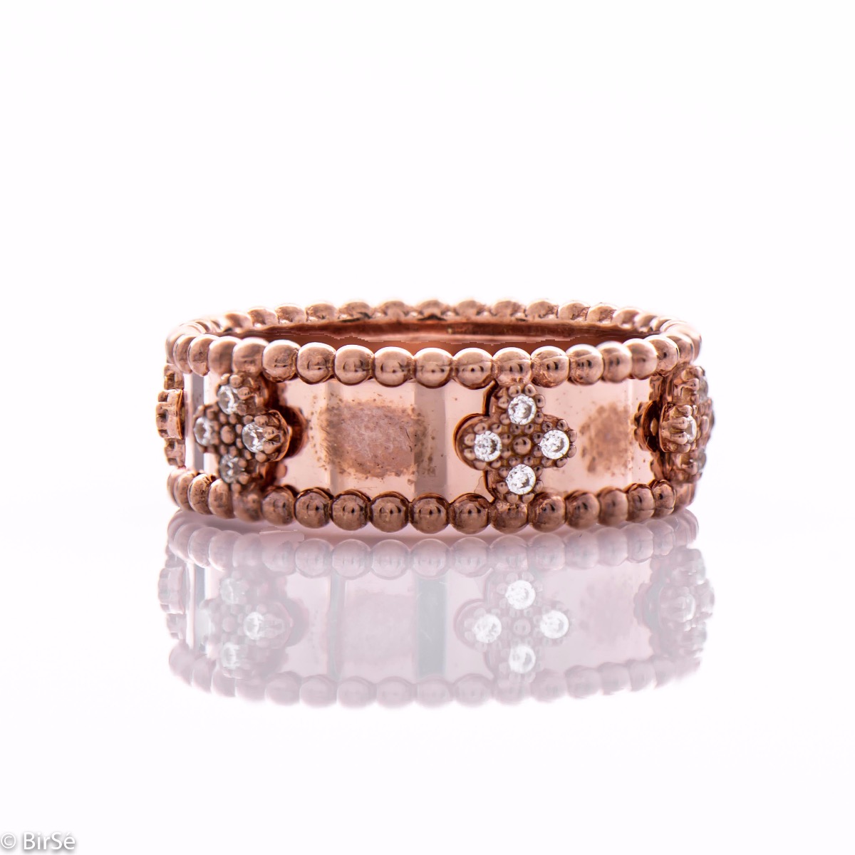Запленяващ пръстен с изключителна изработка и красиви детайли. Нежно розово злато подчертано от блясъка на циркони, за изящен завъшек на всеки тоалет.