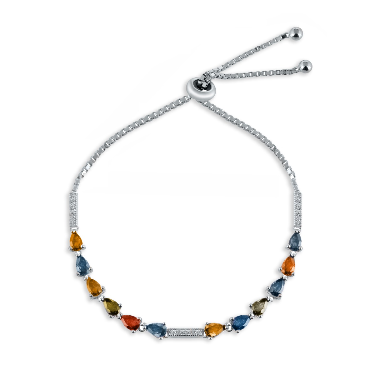Изящна дамска гривна с мека и прецизна изработка, съчетаваща родирано сребро с омагьосващи естествени камъни Мулти Сапфир с капковидна форма. Три фини елемента, инкрустирани с циркони, елегантно разчупват модела. А регулируемия размер на верижката е още едно предимство на бижуто. Всички бижута с естествени камъни са придружени от специален сертификат, удостоверяващ автентичността им. На този сертификат можем да изпишем и лично послание за Вас или за когото е бижуто.