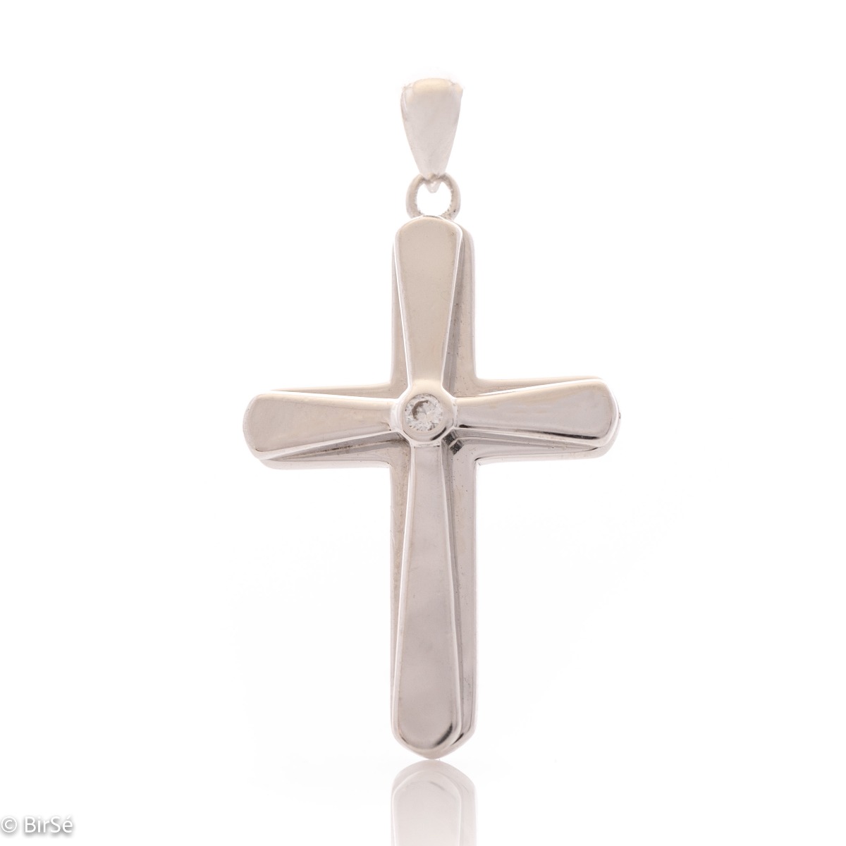Строго-елегантен сребърен кръст с красиво изваяни елементи на дизайна. Стилна и ефектна изработка на детайлите изцяло от красиво родирано сребро с добавен един единствен циркон за разкош.