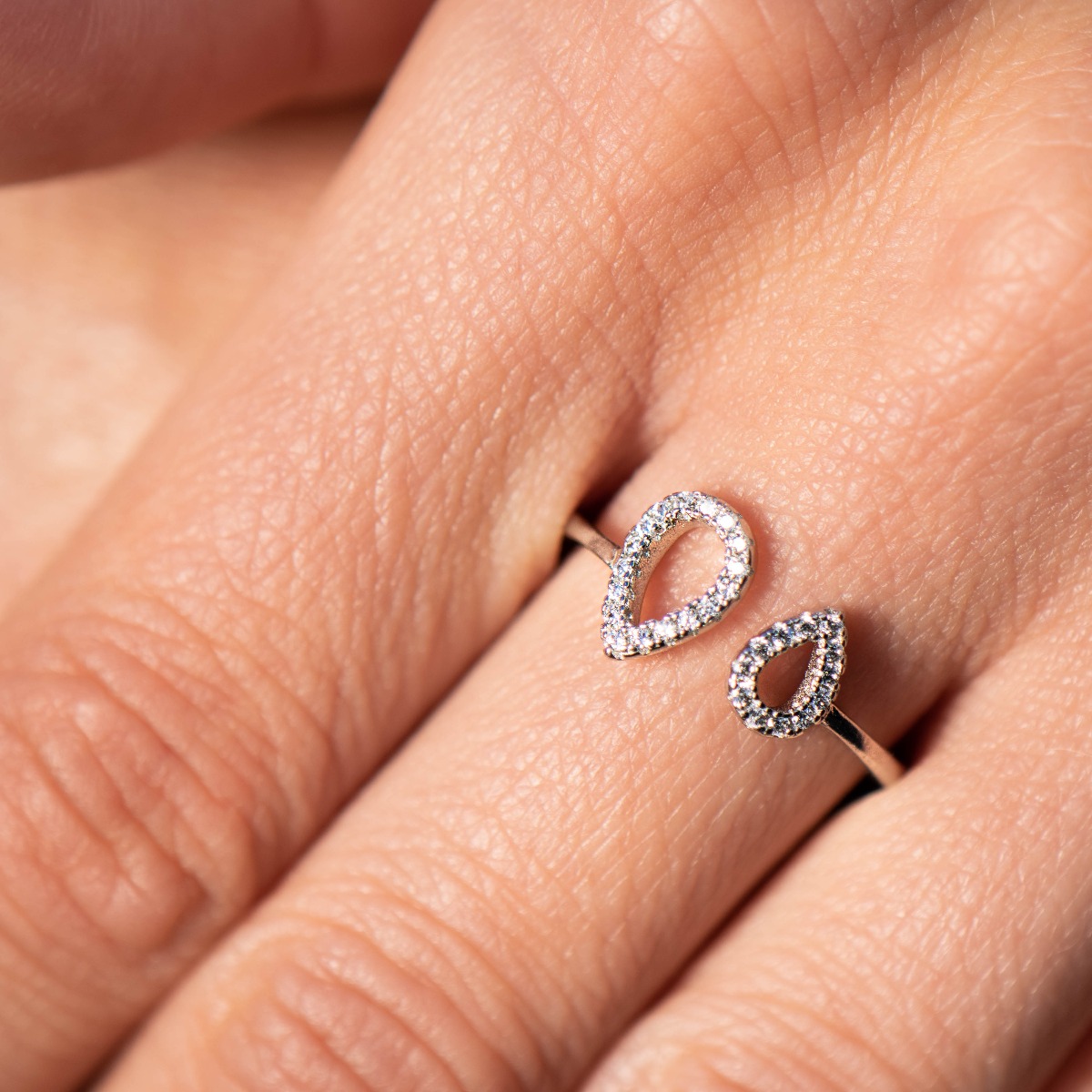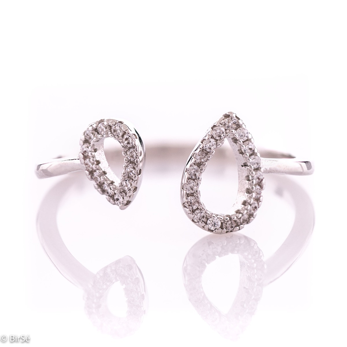 Изключително ефектен дамски пръстен с модернистична и изящна визия. Стилна композиционна изработка на елементите и формите от фино съчетание на елегантно родирано сребро и искрящи камъни циркони. Моделът е отворен, за по-голямо удобство при регулиране на размера.