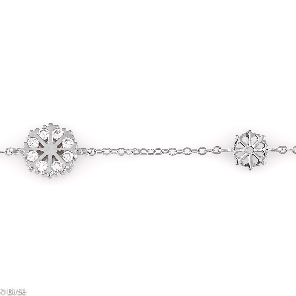 Нежна мека гривна с очарователна форма на снежинка, изработена изцяло от родирано сребро, допълнено от бляскави циркони.