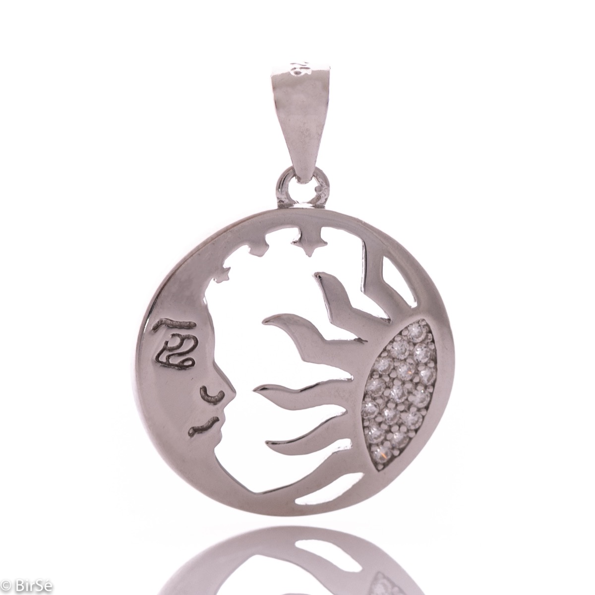 Ефектна дамска висулка с изящна и интересна изработка, преплитаща слънце и луна с нежни циркони и бляскаво родирано сребро.