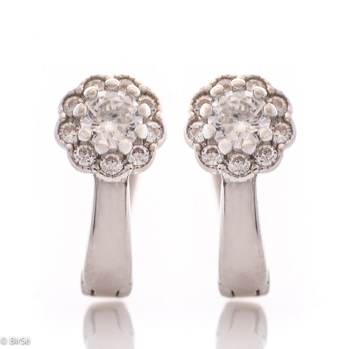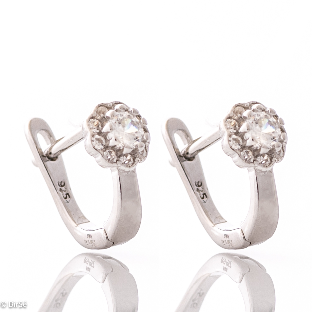 Очарователни дамски обеци, изработени от родирано сребро с удобно английско закопчаване. Предната страна на обеците е с форма на изящни цветя, прилежно изработени от циркони.