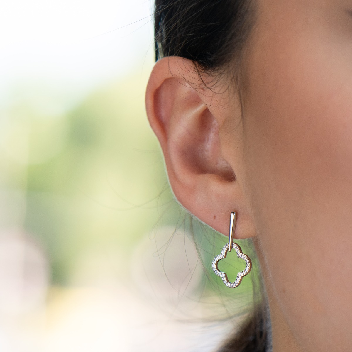 Нежни висящи обеци на щифт с изящна изработка съчетаваща бляскаво родирано сребро с красиви детелинки от фини циркони.