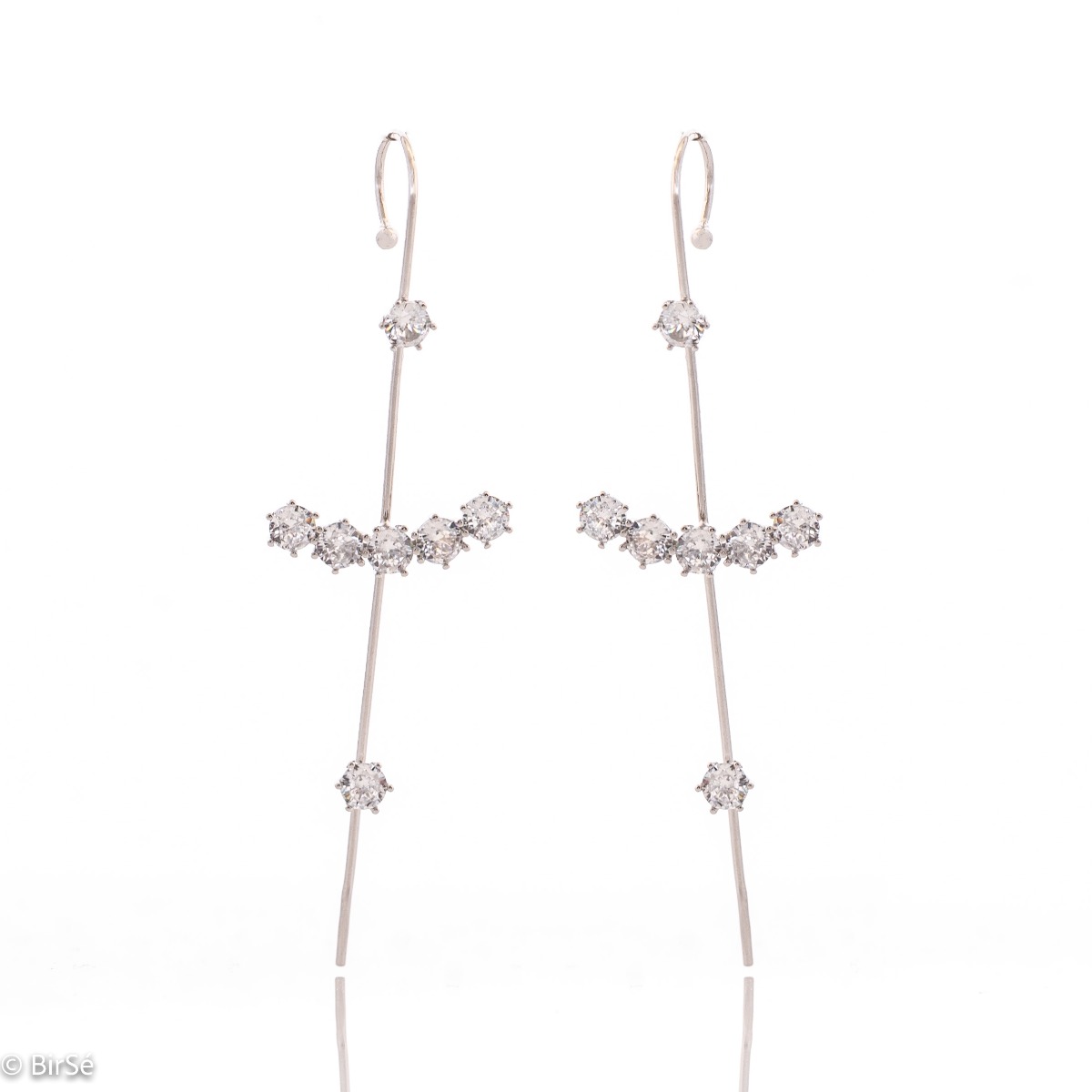 Екзотични дамски обеци с промушване, майсторски изработени от фино родирано сребро с елегантен дизайн. Елементите са красиво изваяни, ослепителни циркони чаровно пробляскват върху среброто, а закопчаването е удобно и практично.