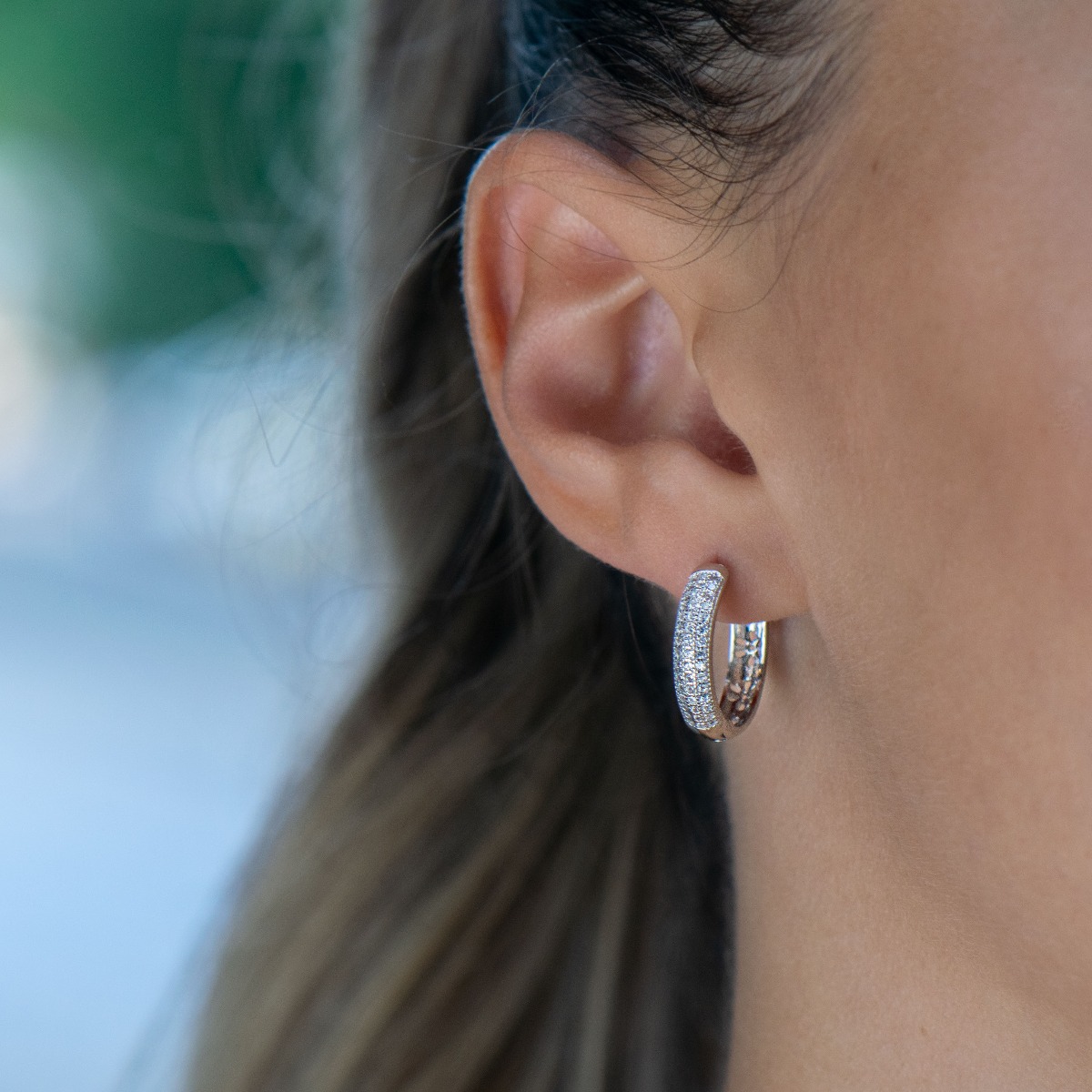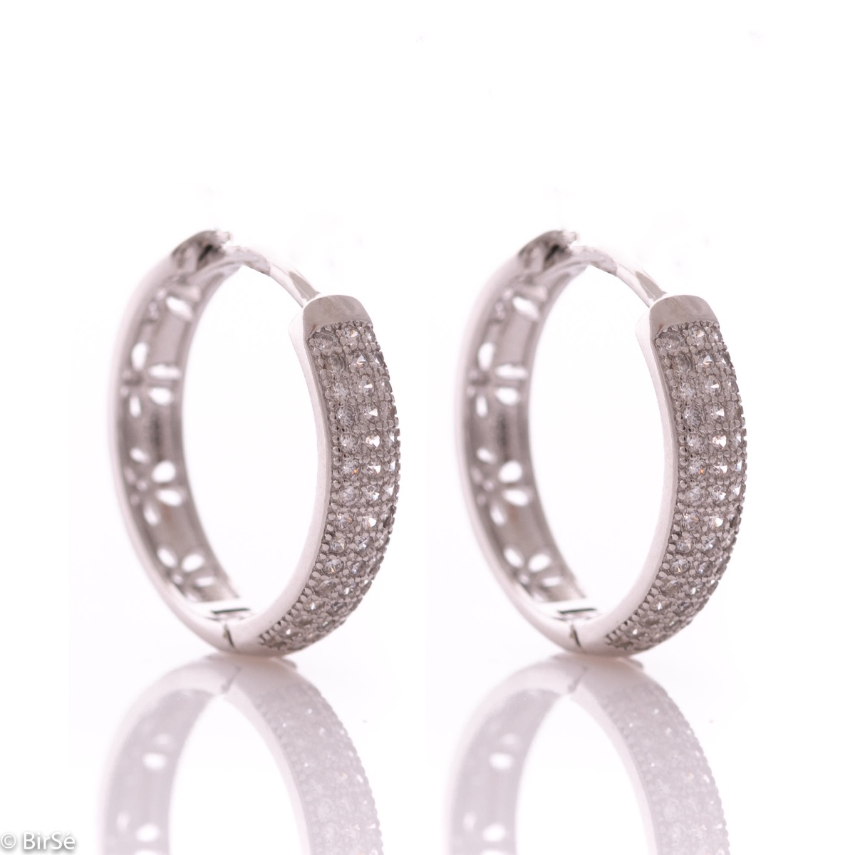 Елегантни дамски обеци халки с нежни детайли на цветенца и прецизна изработка изцяло от бляскаво родирано сребро, допълнено от фини циркони.