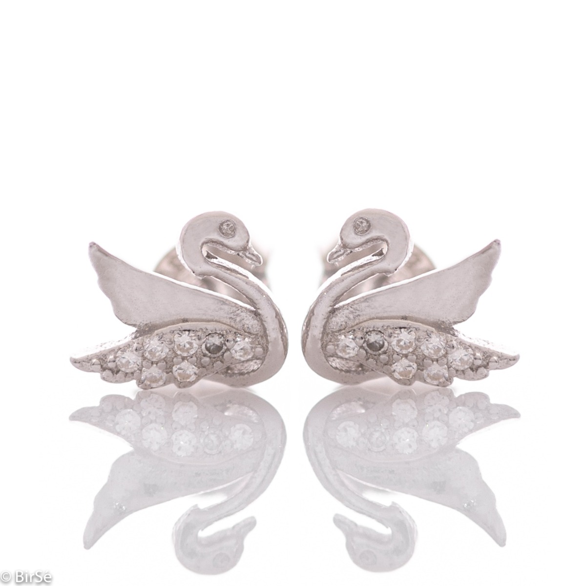 Нежни и бляскави дамски обеци на щифт с изящна форма на лебедче, допълнено от фини циркони и изработка изцяло от родирано сребро. Подходящи за малки и големи дами. Всички бижута са подаръчно опаковани и придружени от сертификат за качество и гаранция.