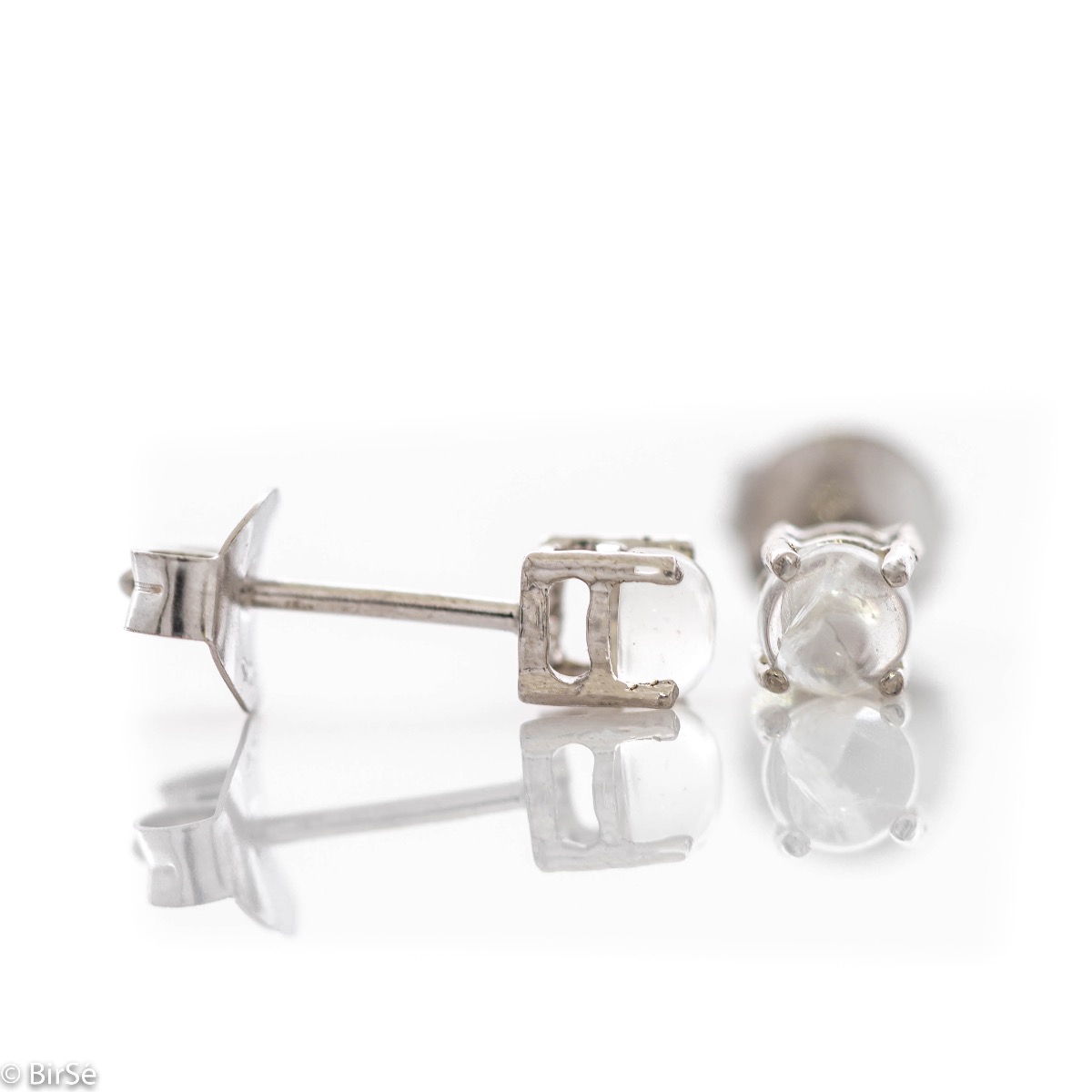 Нежни и фини обеци на щифт, подходящи както за дамите, така и за деца, с прецизна изработка от красиво родирано сребро, допълнено от сияен естествен лунен камък. Всички бижута с естествени камъни са придружени от специален сертификат, удостоверяващ автентичността им. На този сертификат можем да изпишем и лично послание за Вас или за когото е бижуто. Вижте още информация тук.