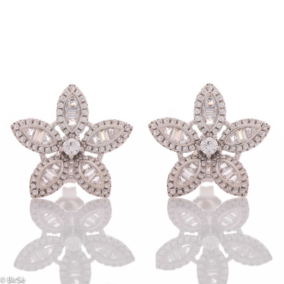 Майсторска изработка на обеци от родирано сребро с форма на цвете. Обеците са украсени с бляскави циркони с различна форма и големина и изглеждат изумително. Закопчаването е удобно със щифт.Всички бижута са подаръчно опаковани и придружени от сертификат за качество и гаранция.