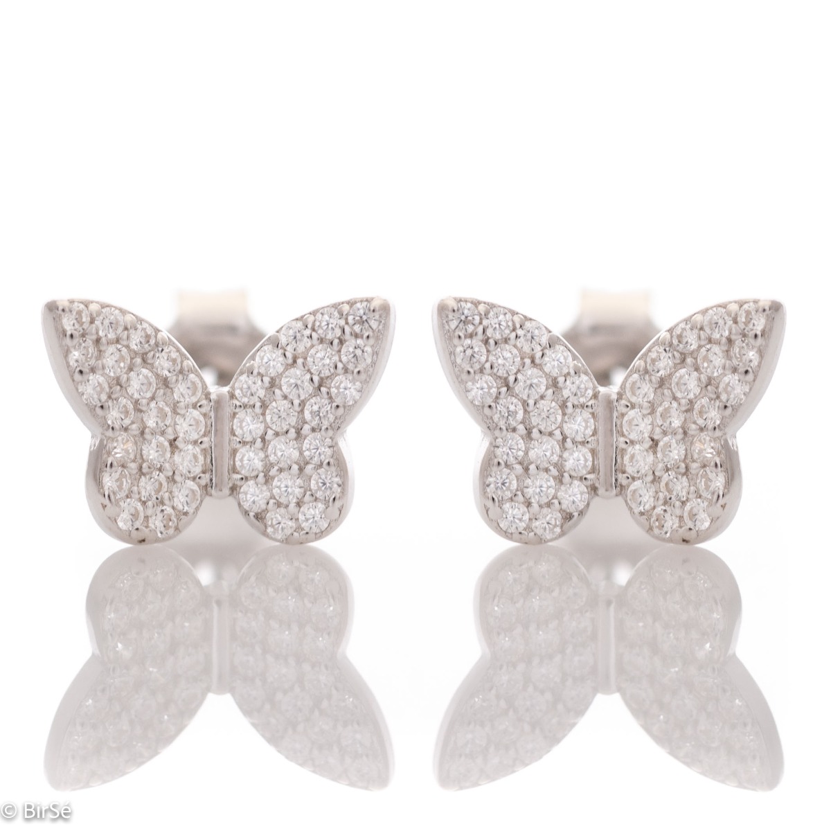 Нежни дамски обеци от фино родирано сребро, с дизайнерски оформена пеперуда обсипана с пробляскващи циркони. Обеците са със закопчаване щифт - изключително удобно и сигурно. Подходящ подарък за момичето на сърцето Ви.