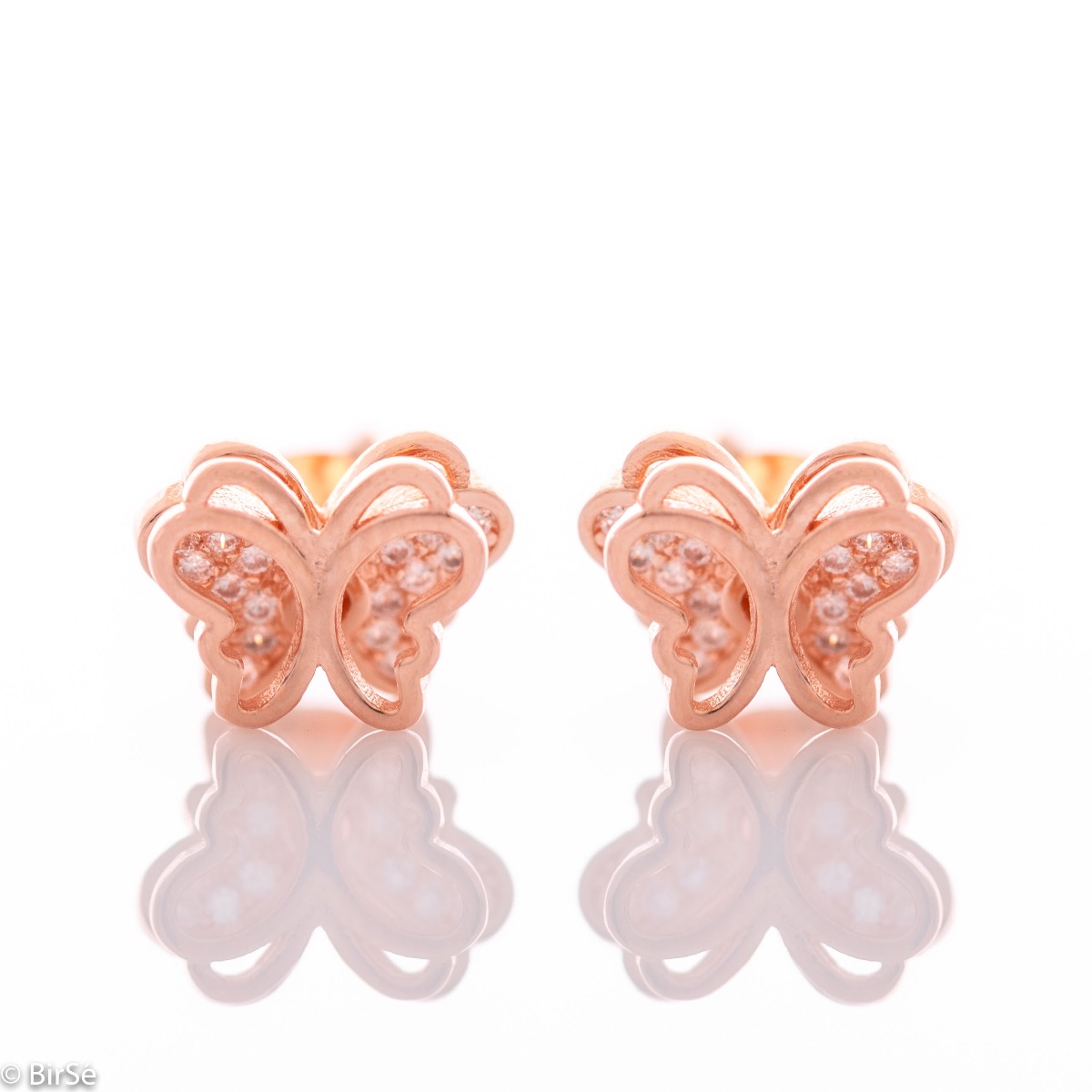 Нежни обеци-пеперуди от розово сребро с изящно изработени детайли, украсени с циркони. Състоят се от два елемента, които могат да се носят и самостоятелно, без да губят от красотата си. Всички бижута са подаръчно опаковани и придружени от сертификат за качество и гаранция.