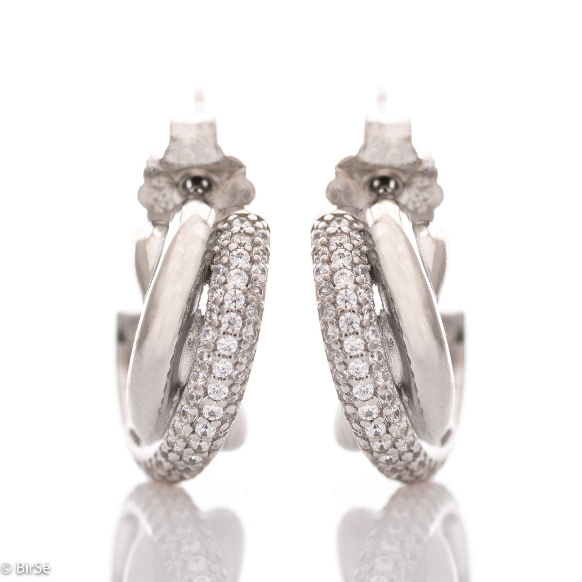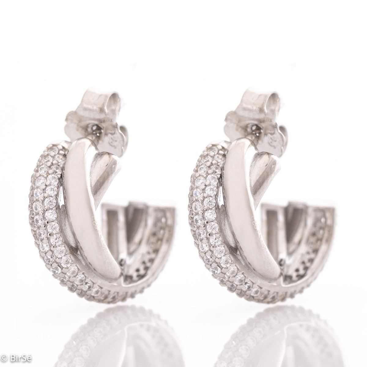 Стилни обеци с изящен дизайн на полухалка, оплетени елементи от родирано сребро, украсени с бляскави циркони. Обеците са с щифт закопчаване - практично и сигурно.