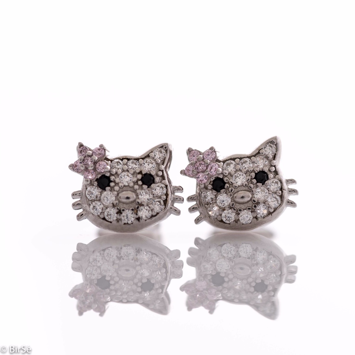 Сладки детски обици на щифт с нежно съчетание на родирано сребро с бляскави и фини циркони и очарователна форма на кити.