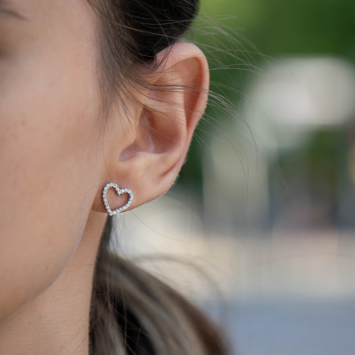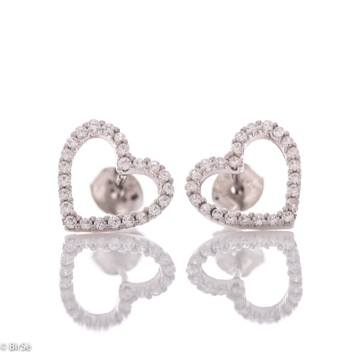 Нежни сребърни обеци на щифт с изящна изработка изцяло от родирано сребро и контур на красиво сърчице, обсипано с циркони. Всички бижута са подаръчно опаковани и придружени от сертификат за качество и гаранция.