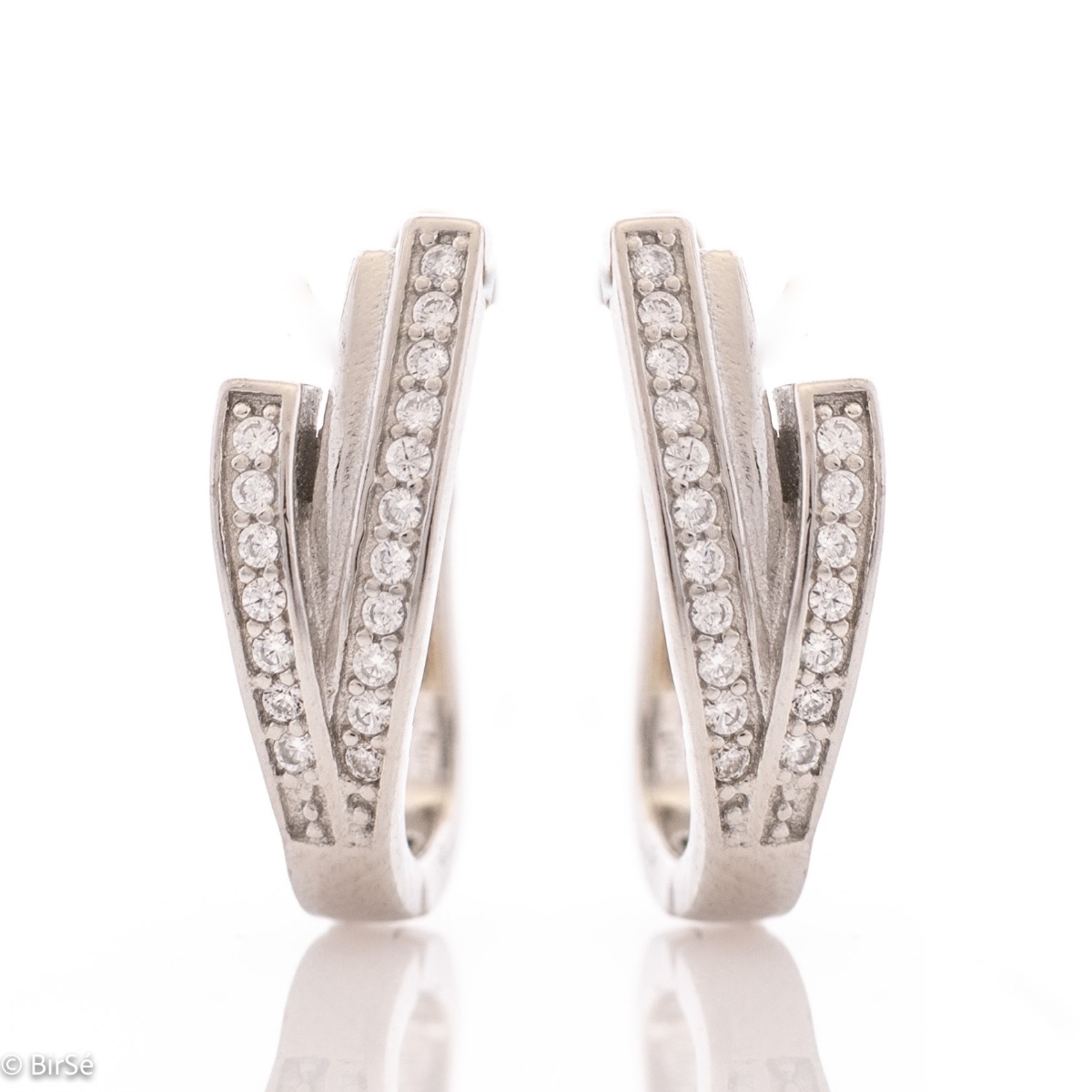 Пленителни дамски обеци с ефектна форма и модерен дизайн. Изработени изцяло от родирано фино сребро с удобното английско закопчаване, те са прекрасен подарък за ежедневния тоалет и прекрасно настроение на Вашата любима жена. А добавените циркони дават повече блясък и очарование на бижуто.
