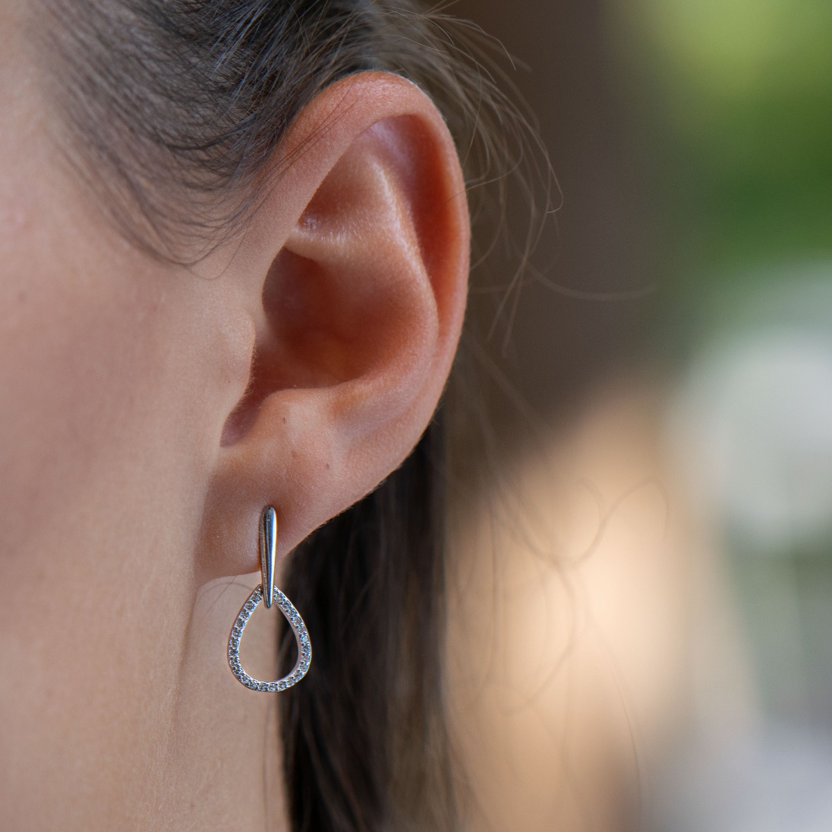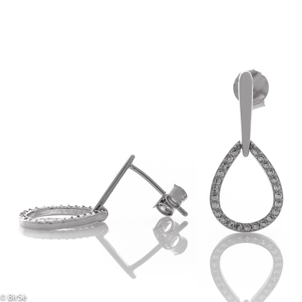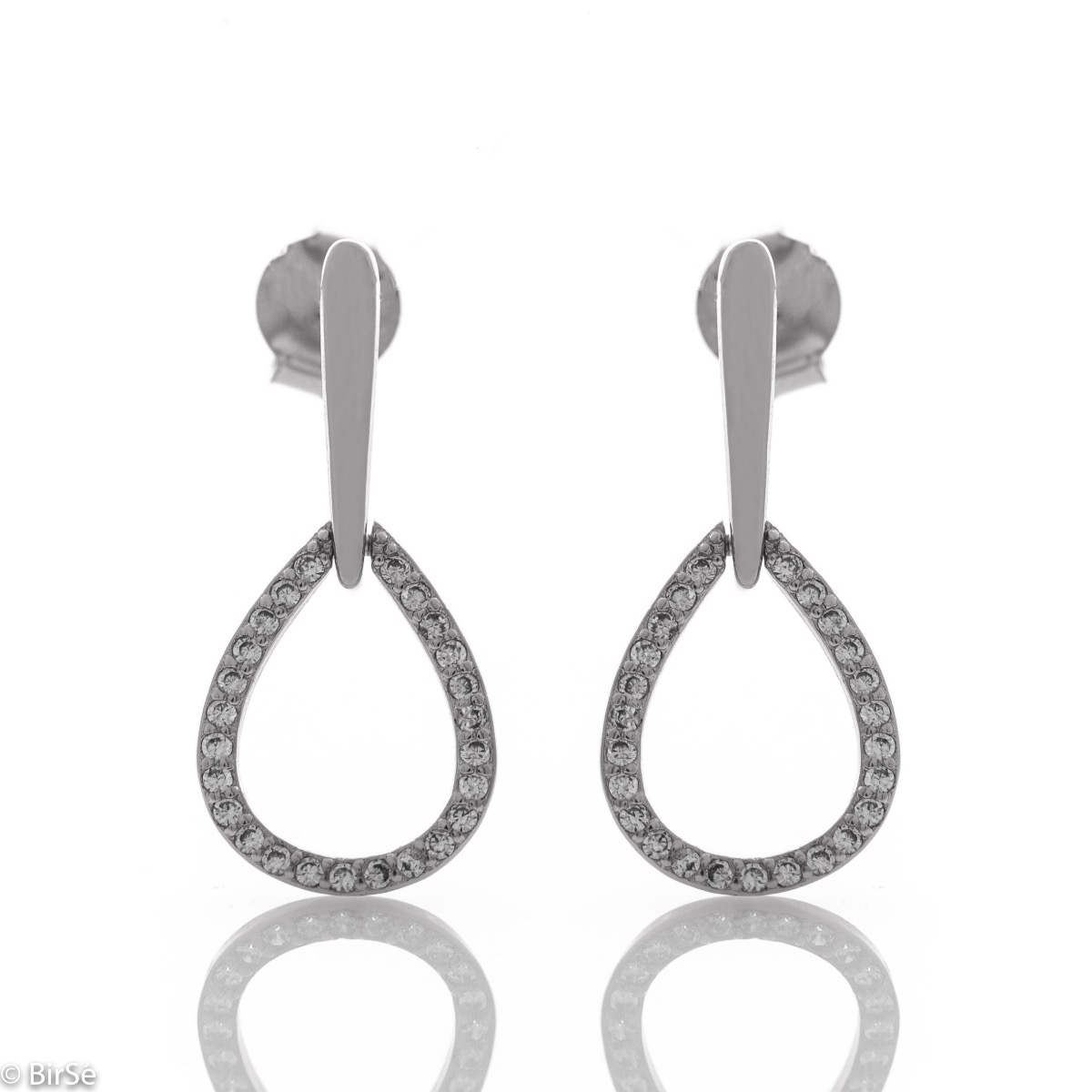 Нежни висящи обеци с изящна изработка изцяло от родирано сребро, съчетаваща ефектно форма с бляскави циркони.