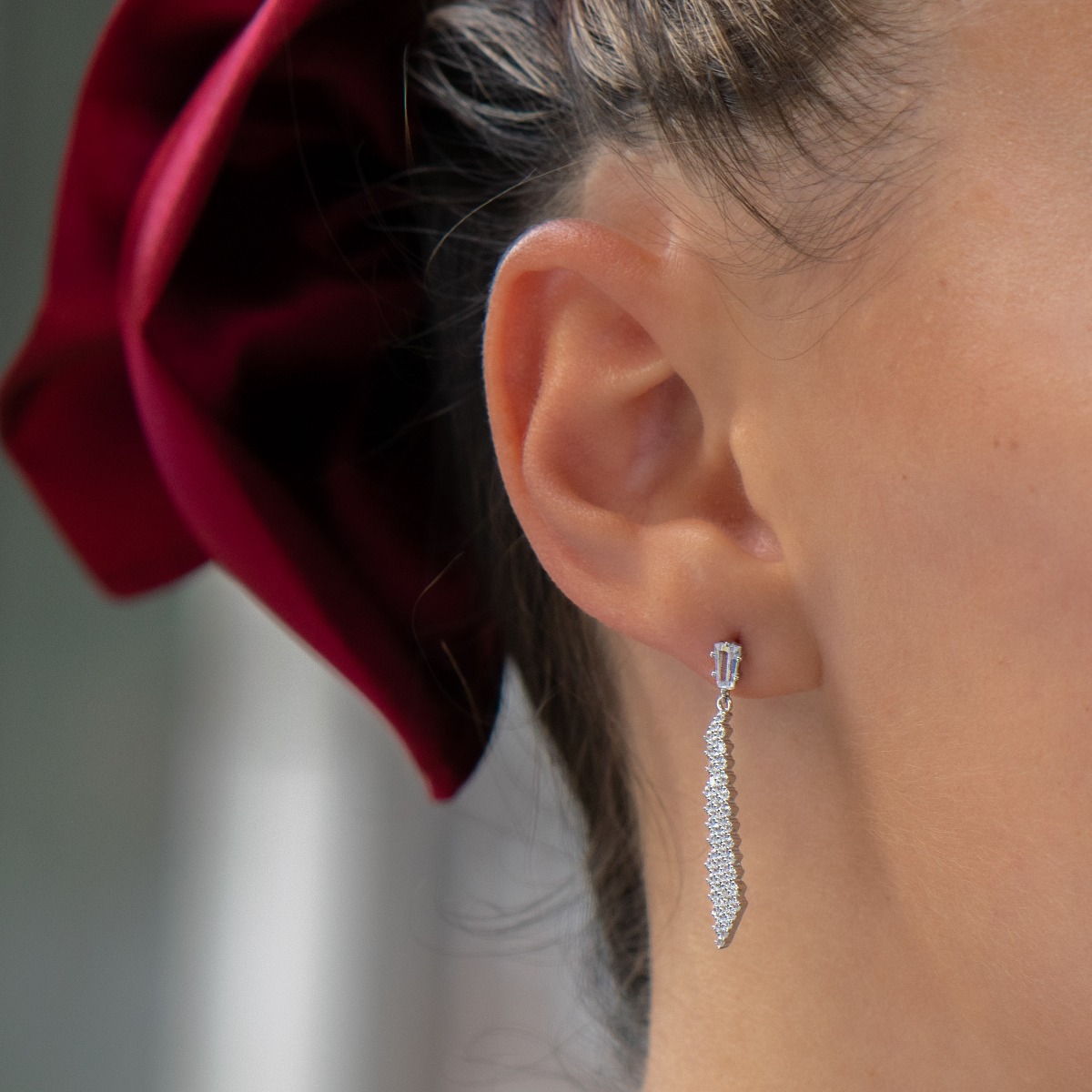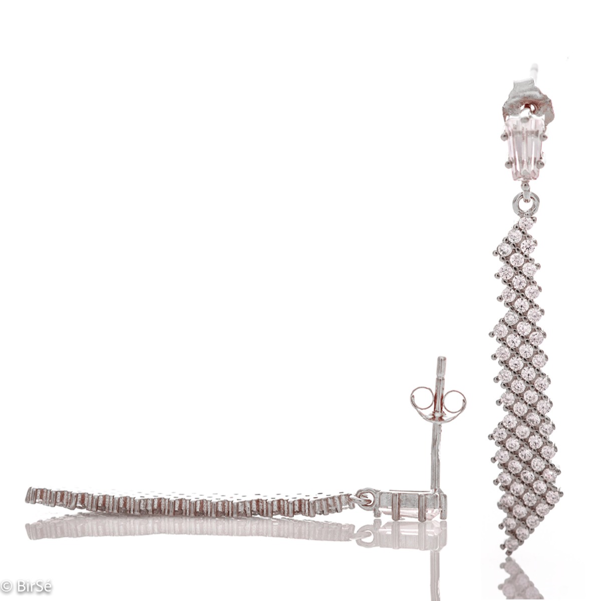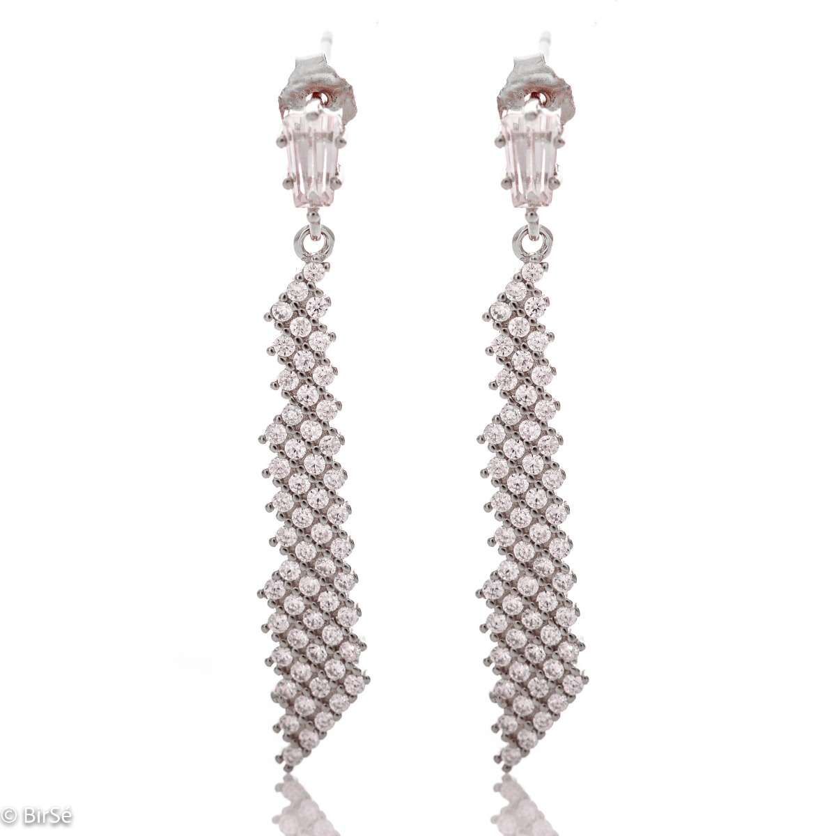 Елегантни обеци със стилен дизайн - фина мрежа от родирано сребро, украсена с бляскави циркони. Чаровен циркон с форма на багет прикрива закопчаване с щифт, предпочитано от дамите като удобно и практично.