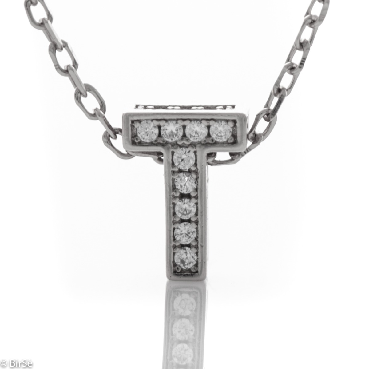 Изтънчена изработка на дамско колие от сребро с буква Т, цялата покрита с бляскави циркони. Атрактивно бижу, в което нежната красота на родираното сребро умело е съчетана с блясъка на цирконите.
