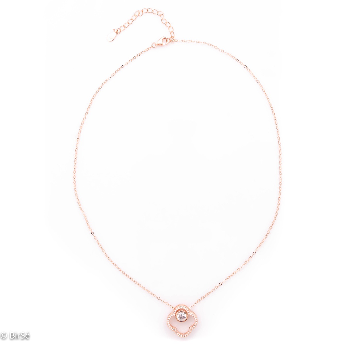 Очарователно колие от розово сребро с елегантно оформен контур на детелина и изящен циркон, танцуващ в средата и. Всички бижута са подаръчно опаковани и придружени от сертификат за качество и гаранция.