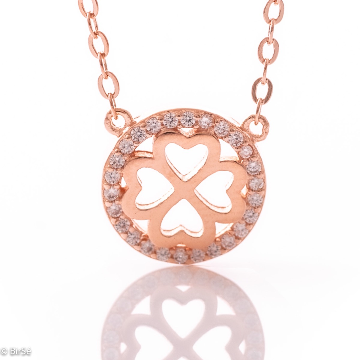 Изящно оформено колие от бляскаво розово сребро кръг, с красива четирилистна детелина отвътре. Вашето колие за късмет и благоденствие Ви очаква в нашия магазин BirSe.